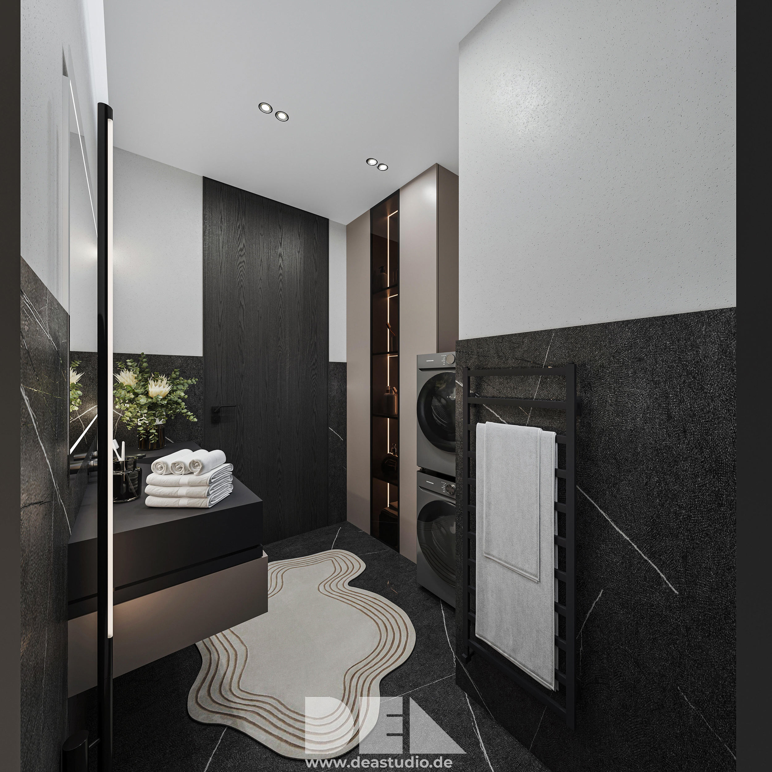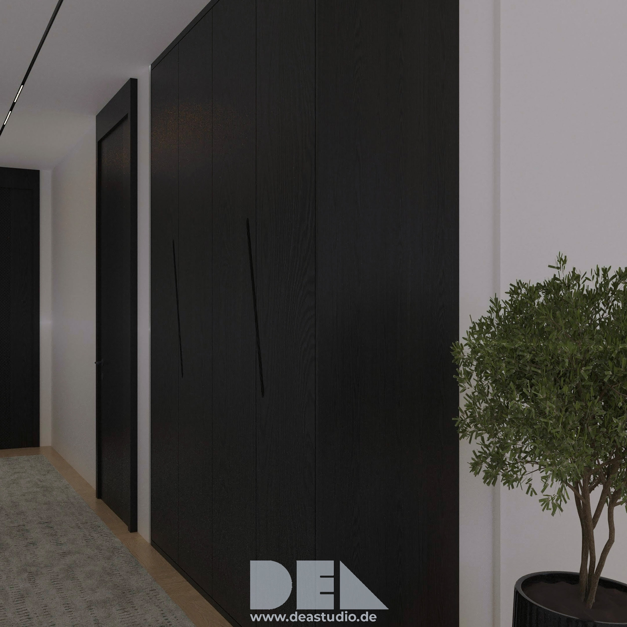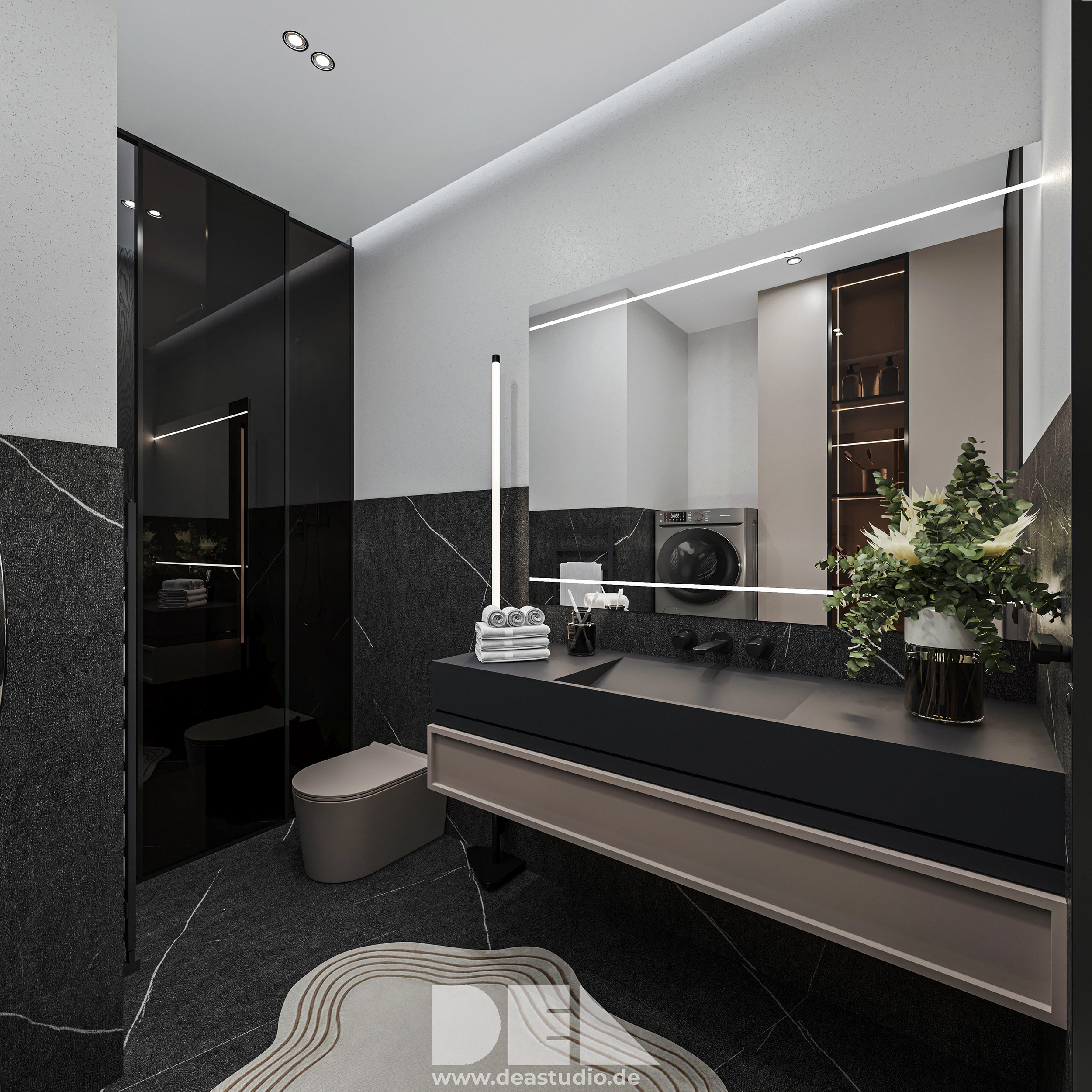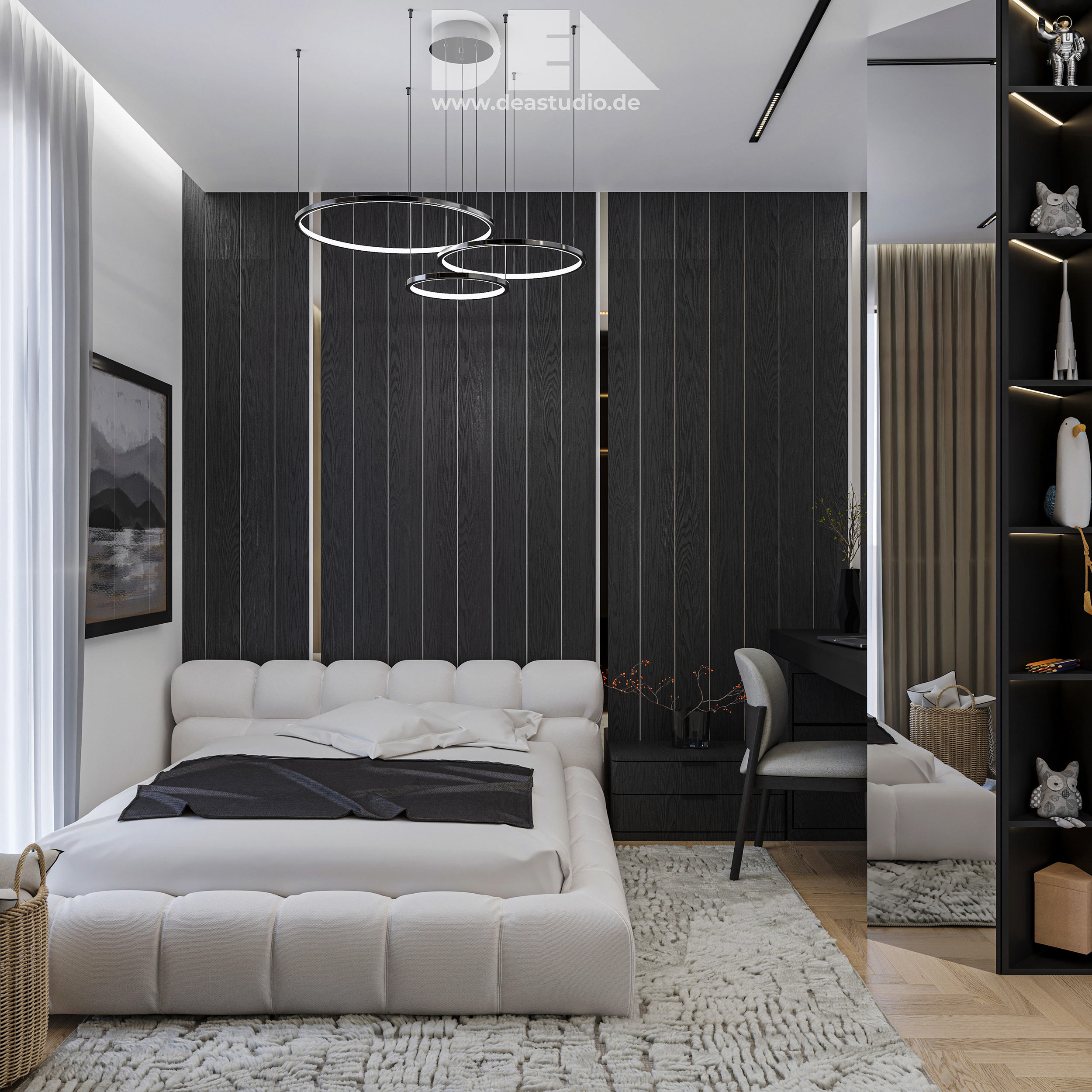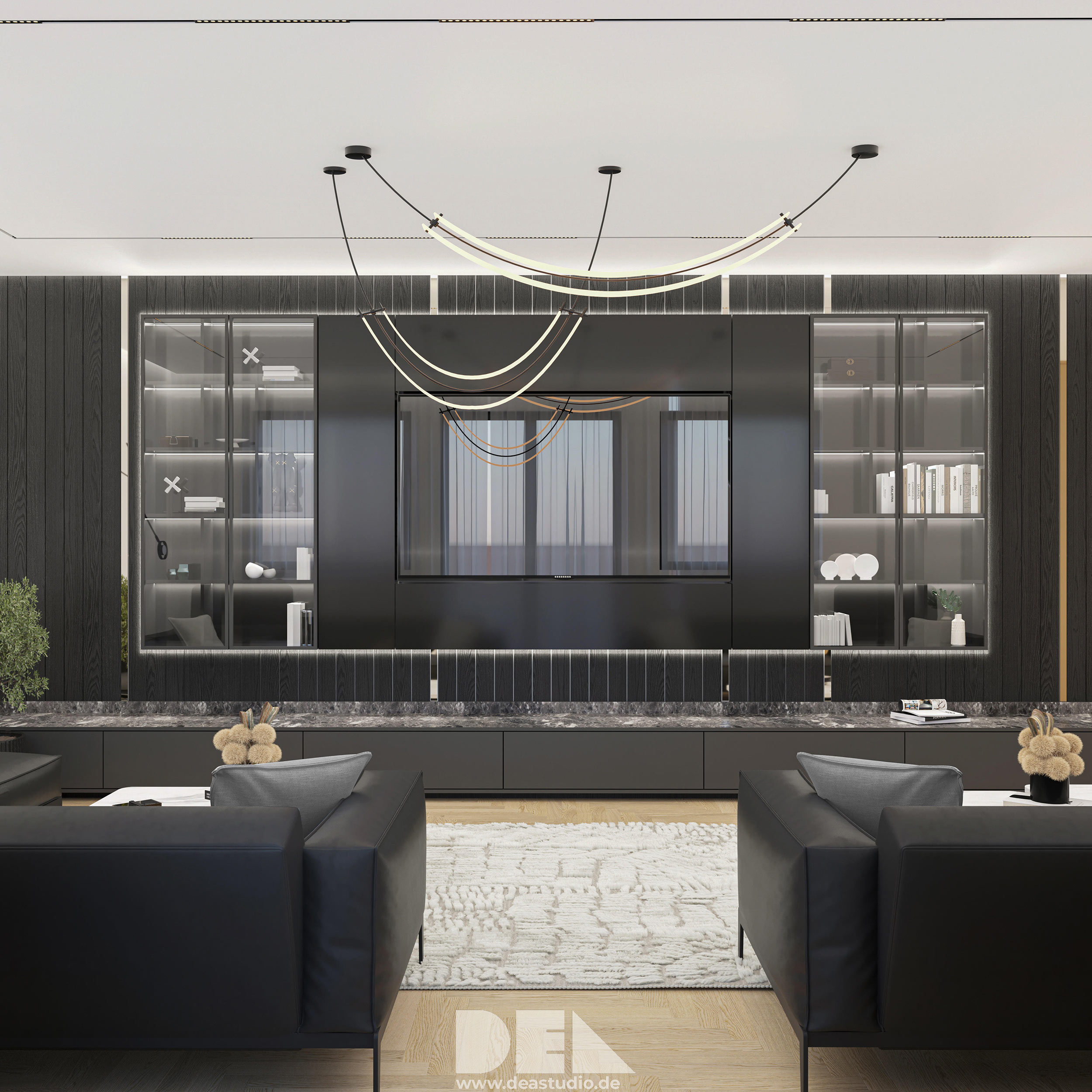 Die Kombination aus dunklen Farben und schwarzem Holz schafft eine reichhaltige und reichhaltige Atmosphäre. Das luxuriöse Gefühl wird durch elegante und moderne Designelemente im gesamten Raum verstärkt.