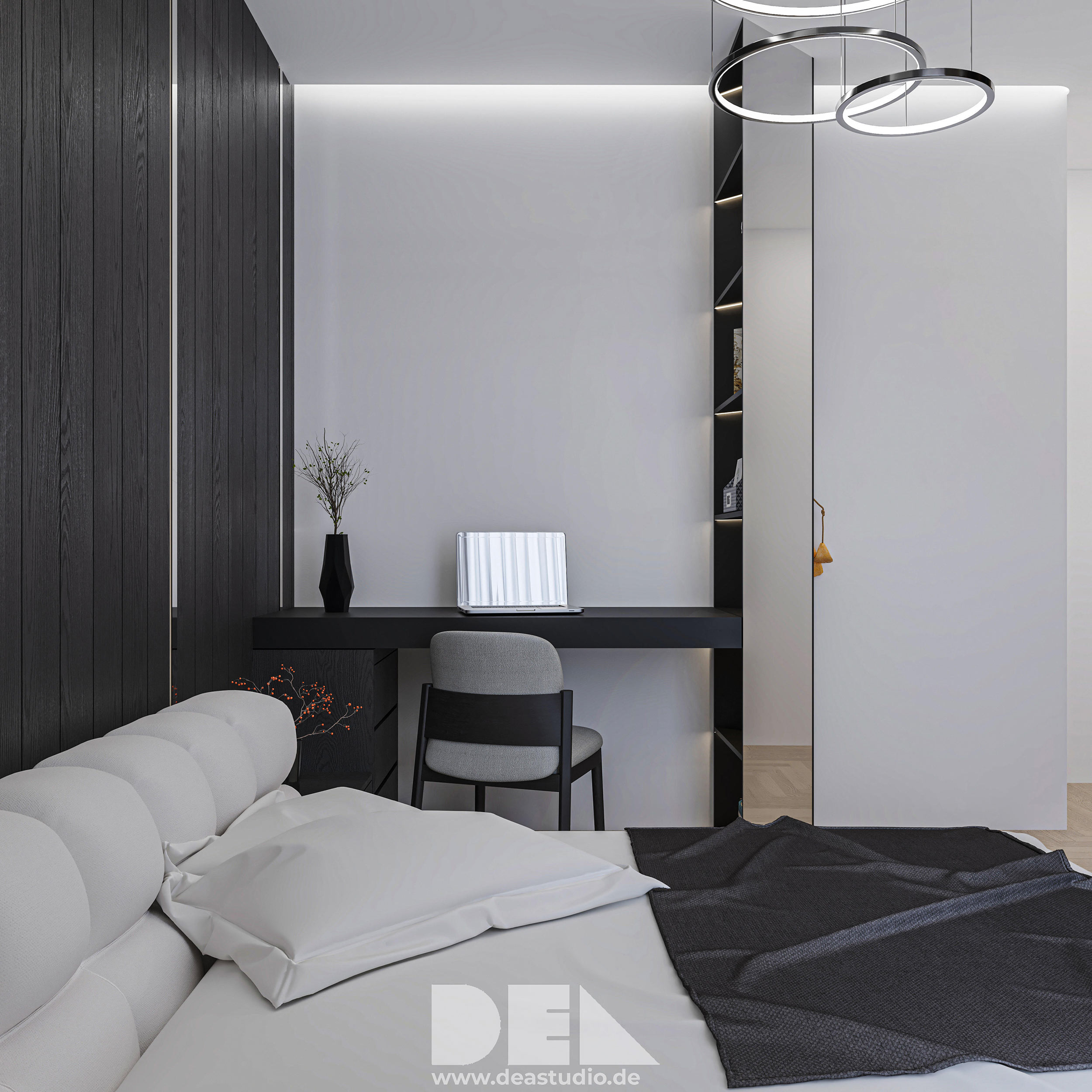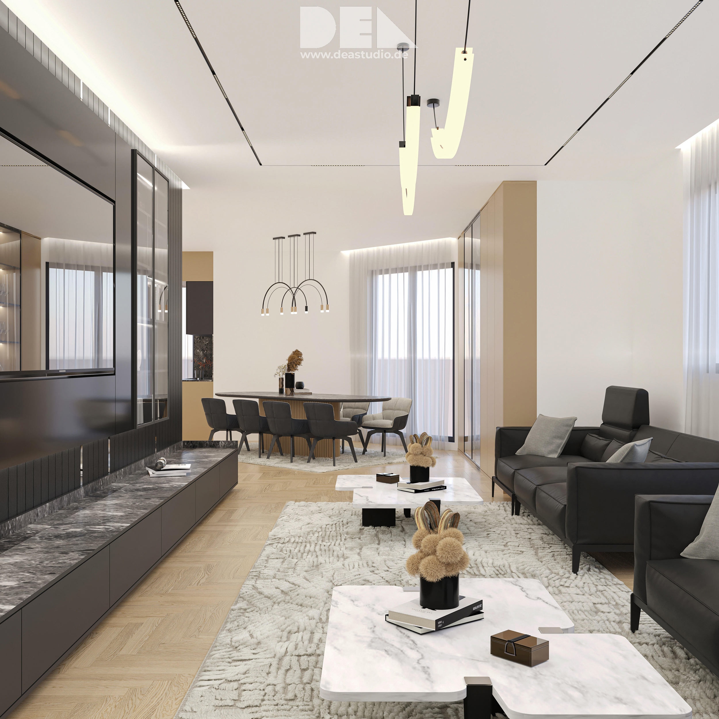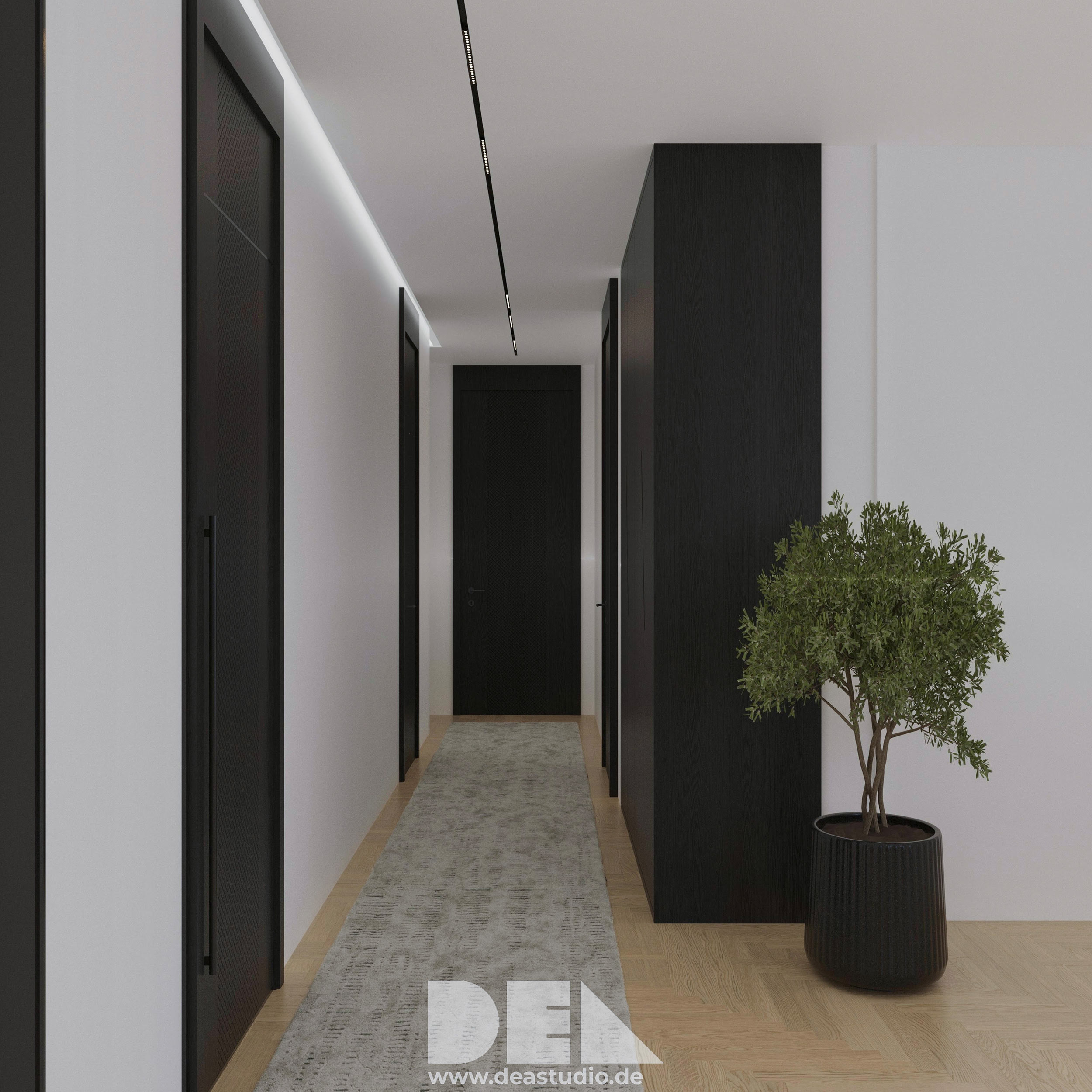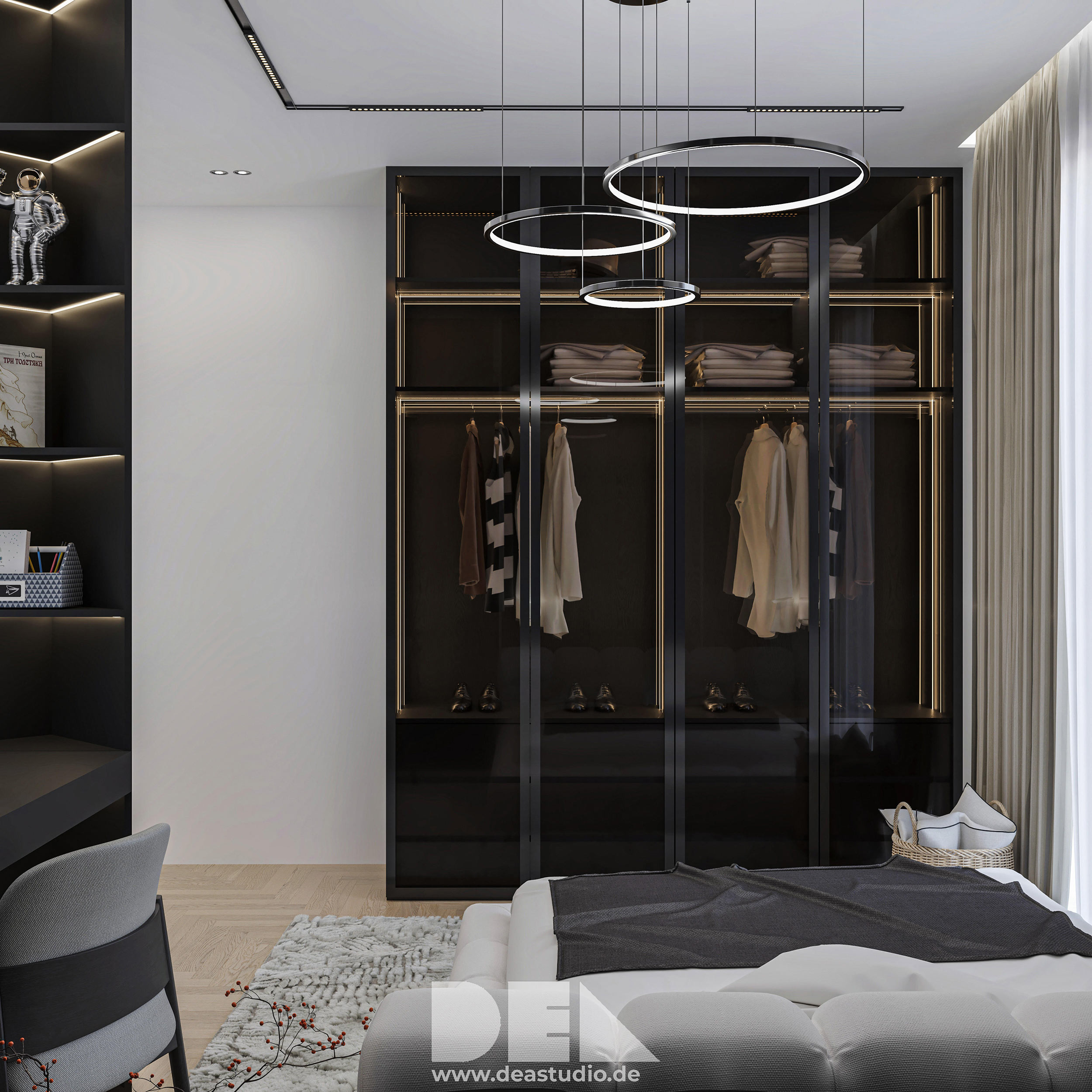 Die Kombination aus dunklen Farben und schwarzem Holz schafft eine reichhaltige und reichhaltige Atmosphäre. Das luxuriöse Gefühl wird durch elegante und moderne Designelemente im gesamten Raum verstärkt.
