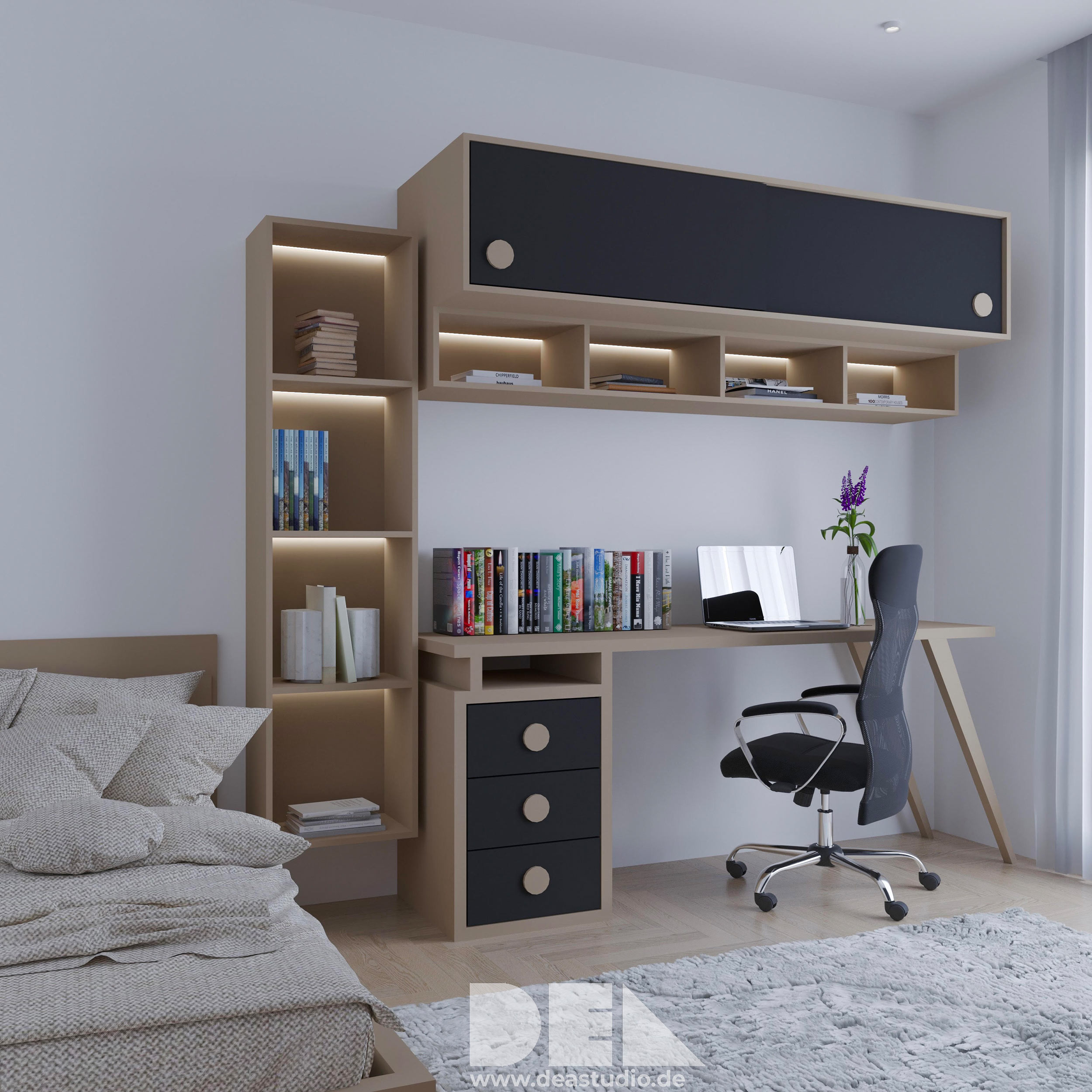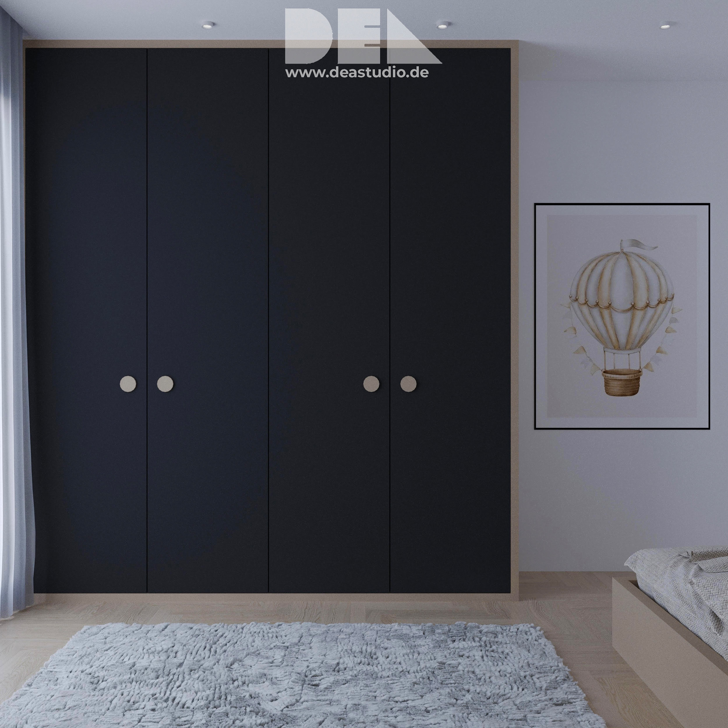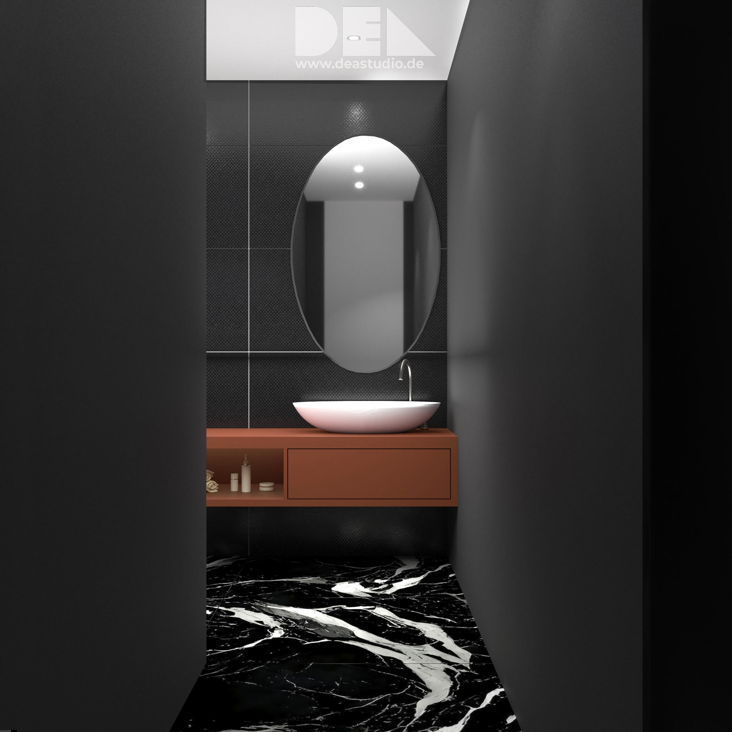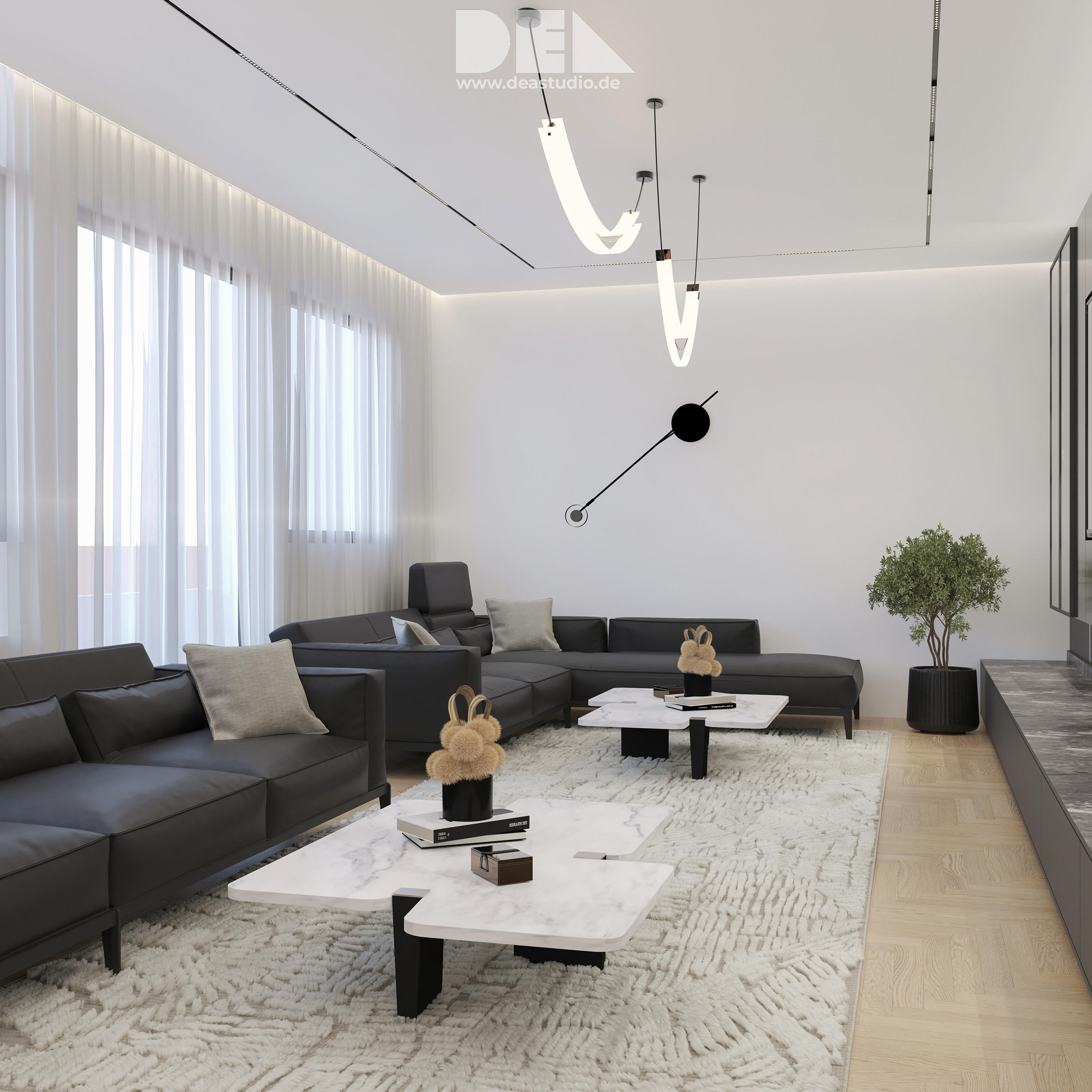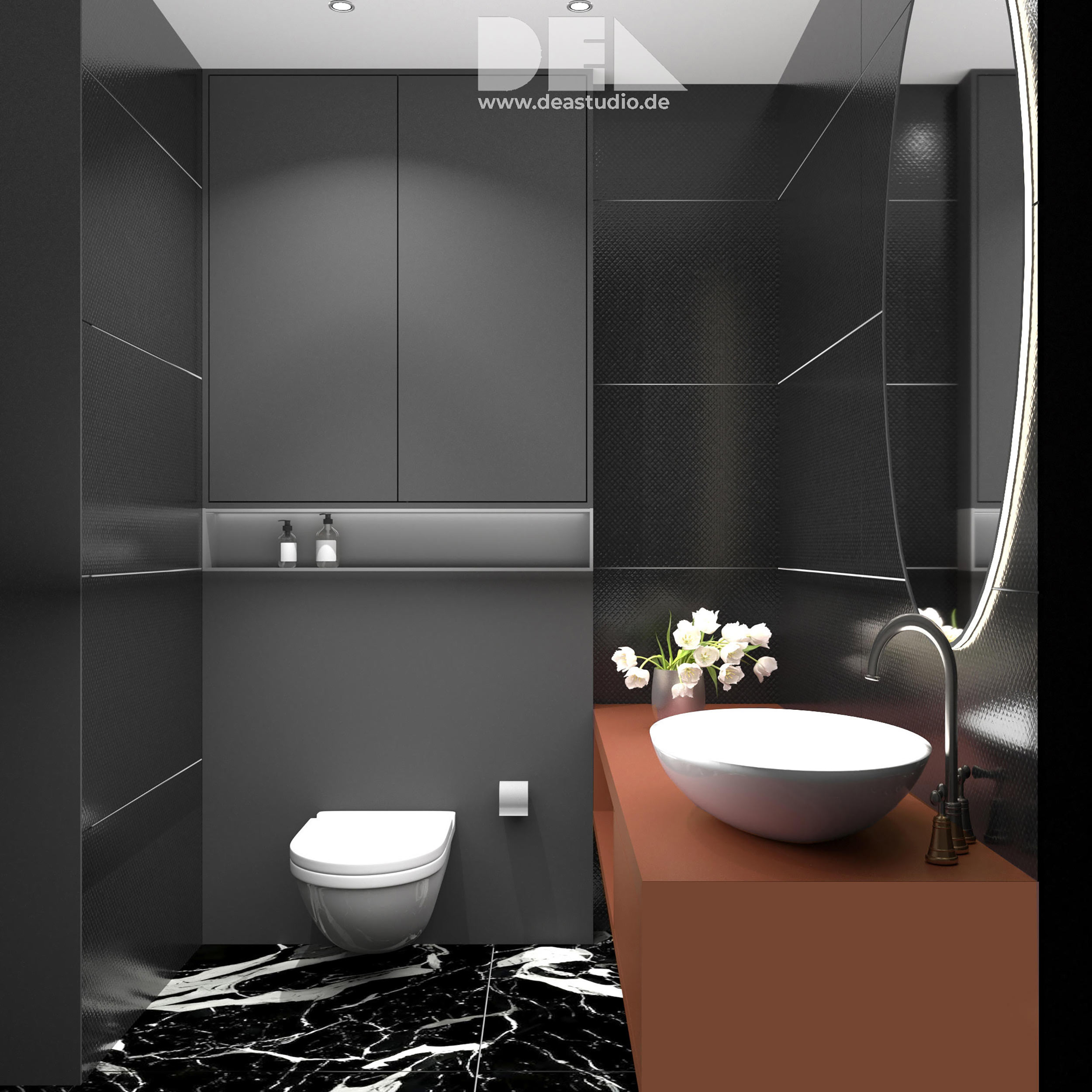 Die Kombination aus dunklen Farben und schwarzem Holz schafft eine reichhaltige und reichhaltige Atmosphäre. Das luxuriöse Gefühl wird durch elegante und moderne Designelemente im gesamten Raum verstärkt.