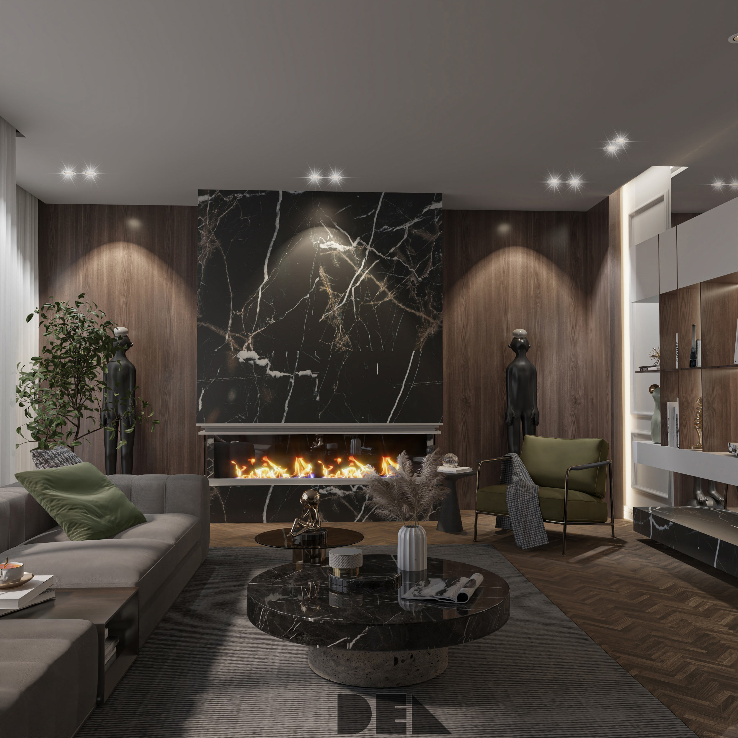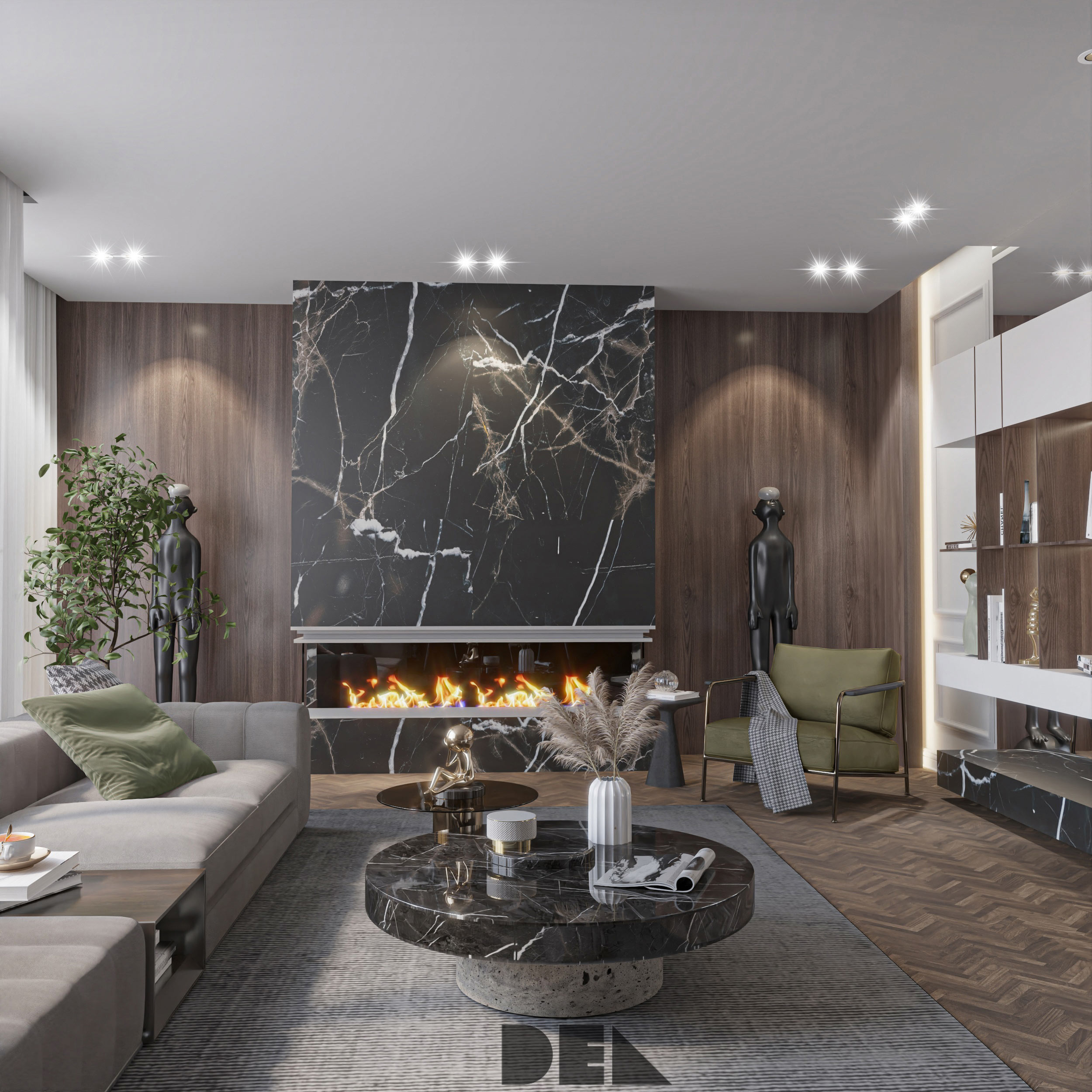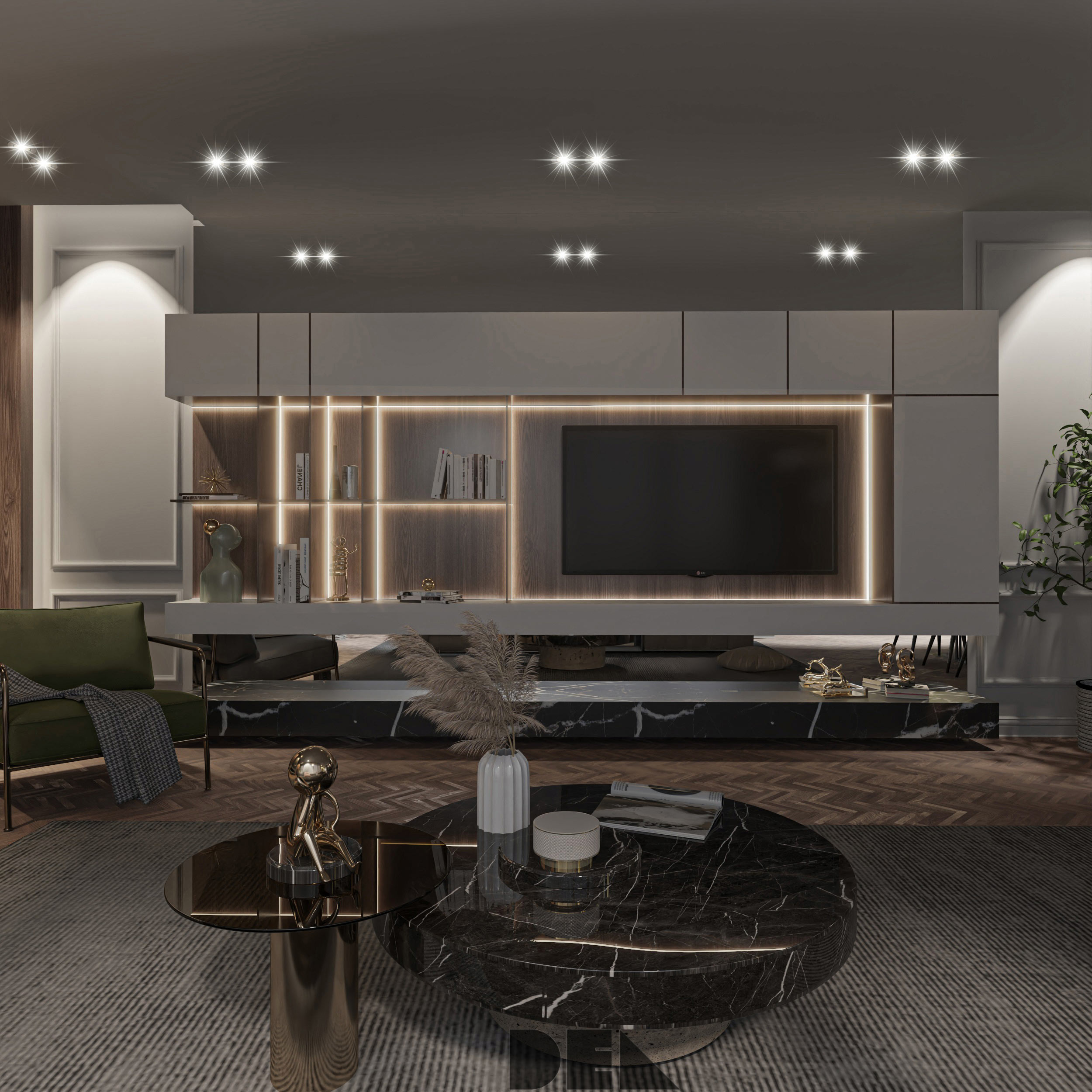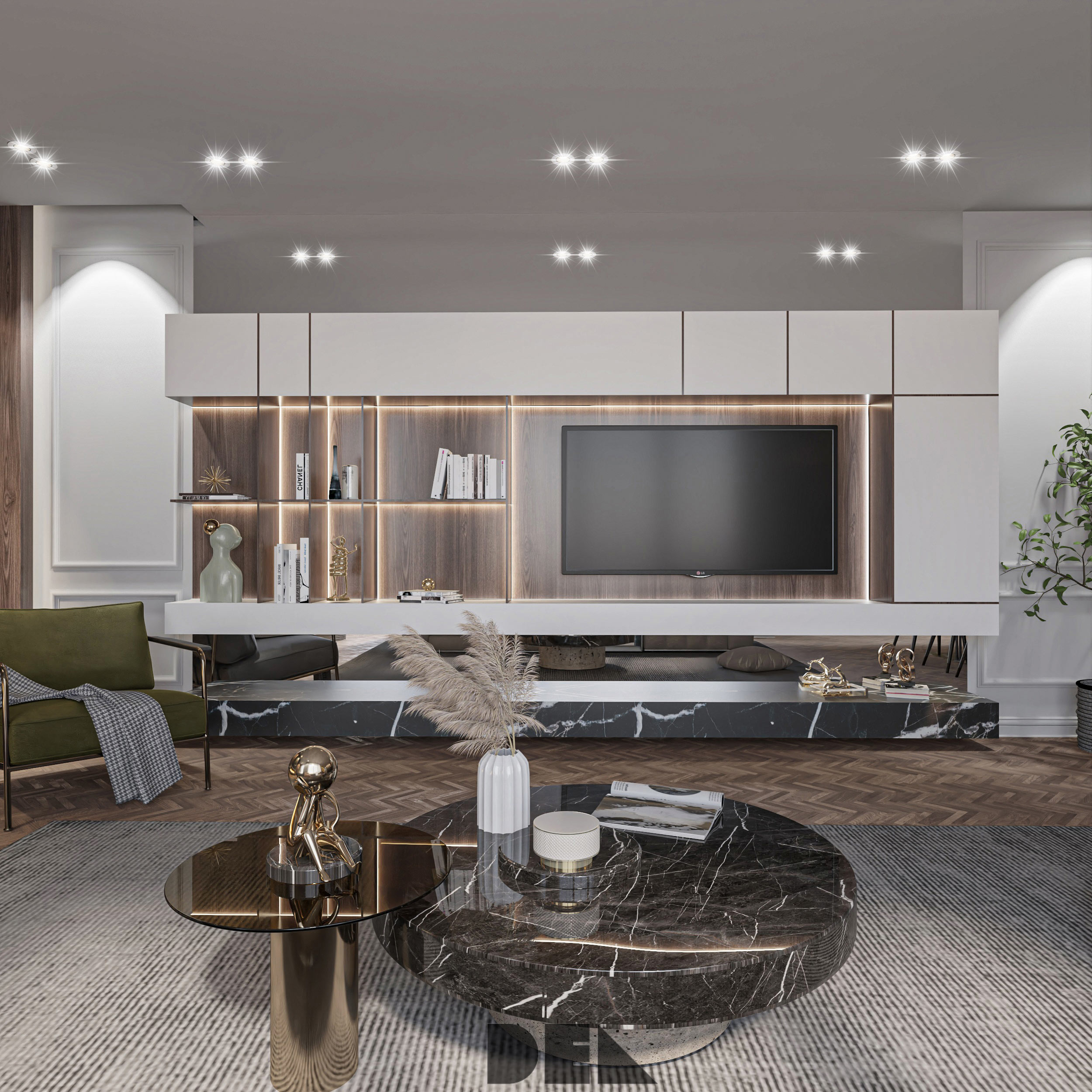 Weiße Sofas und grüne Stühle sorgen für eine gemütliche und einladende Atmosphäre und bilden zudem einen schönen Kontrast zu den dunkleren Holztönen. Der weiße TV-Ständer mit einigen Akzenten aus schwarzem Marmor ist ein schönes und elegantes Möbelstück, das dem Raum ein elegantes Aussehen verleiht.