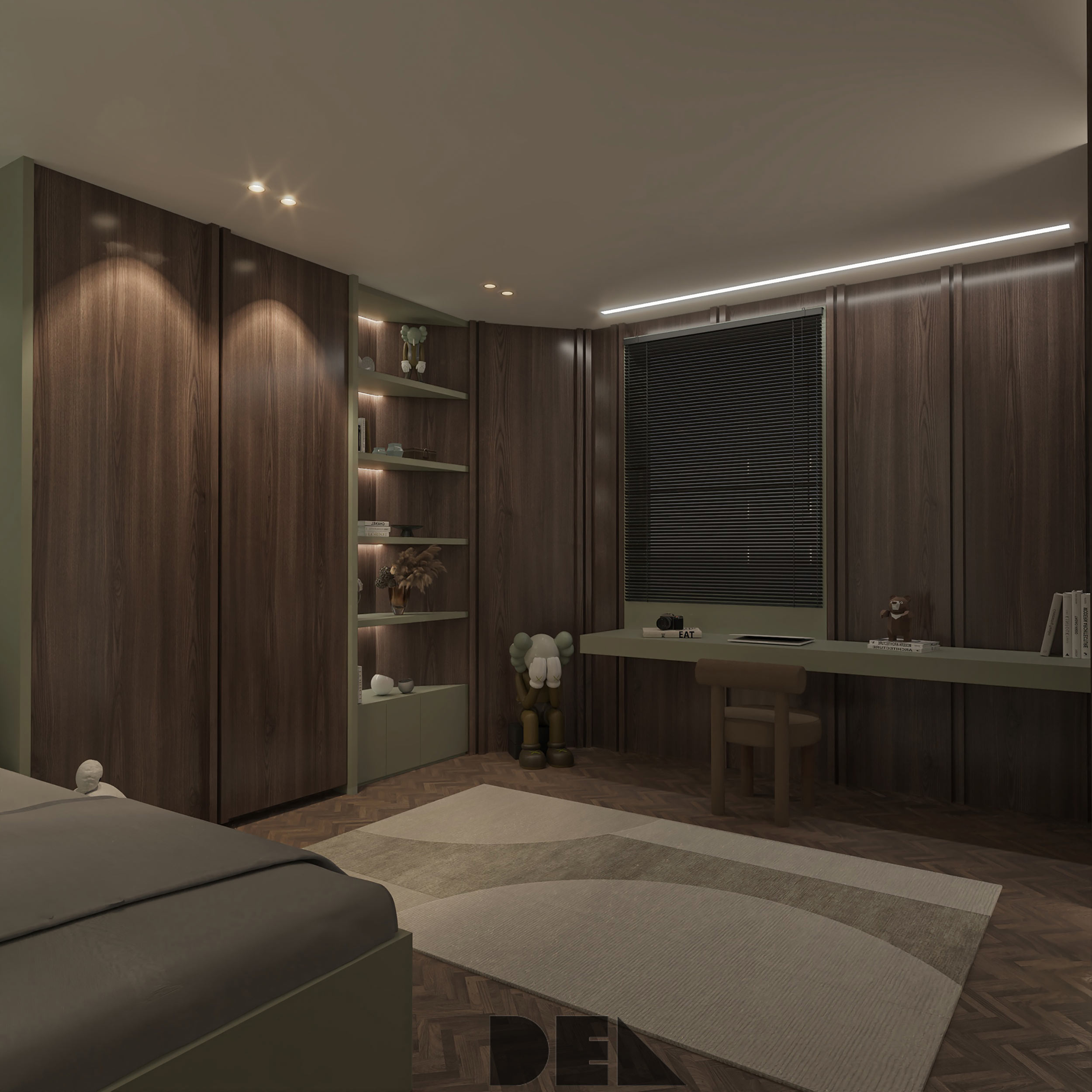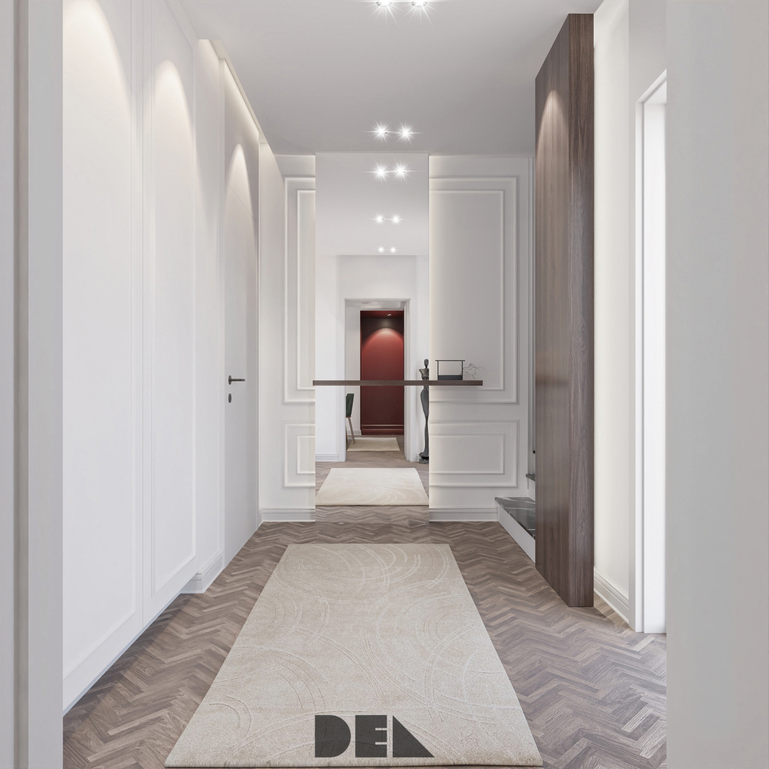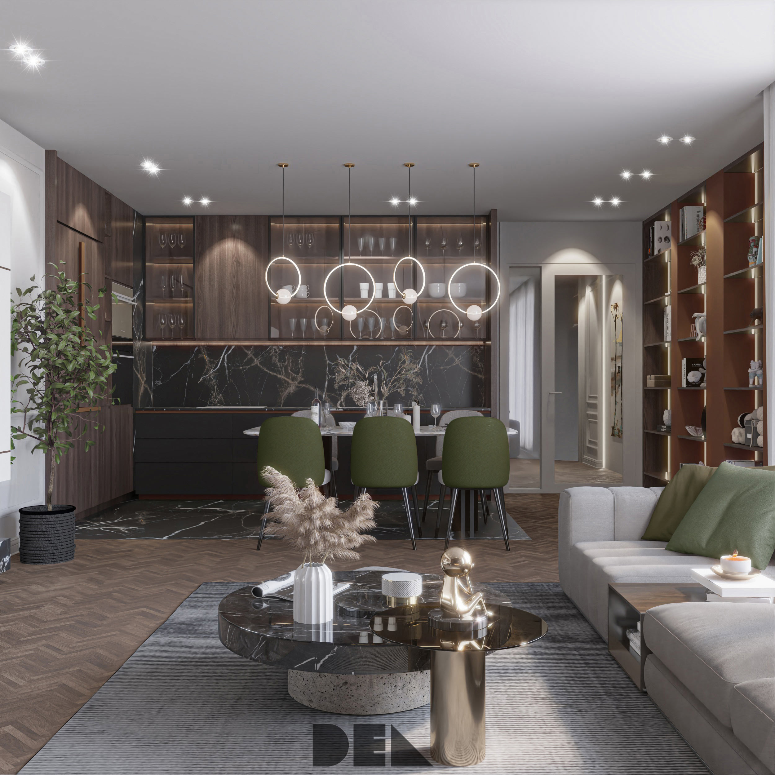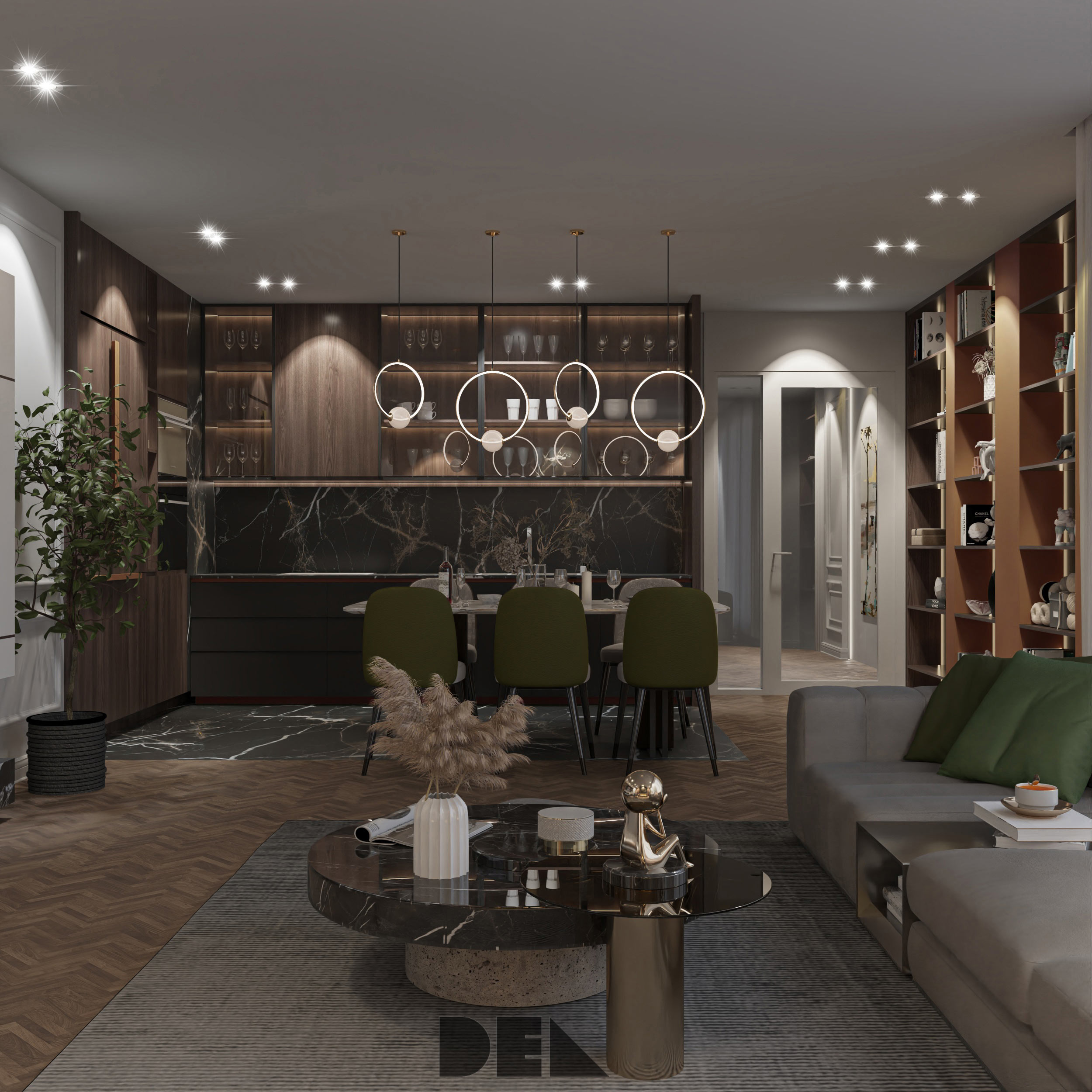 Diese Wohnung ist modern und stilvoll. Schwarze Texturen und dunkelbraunes Holz im gesamten Raum sorgen für einen Hauch von Raffinesse und Eleganz.