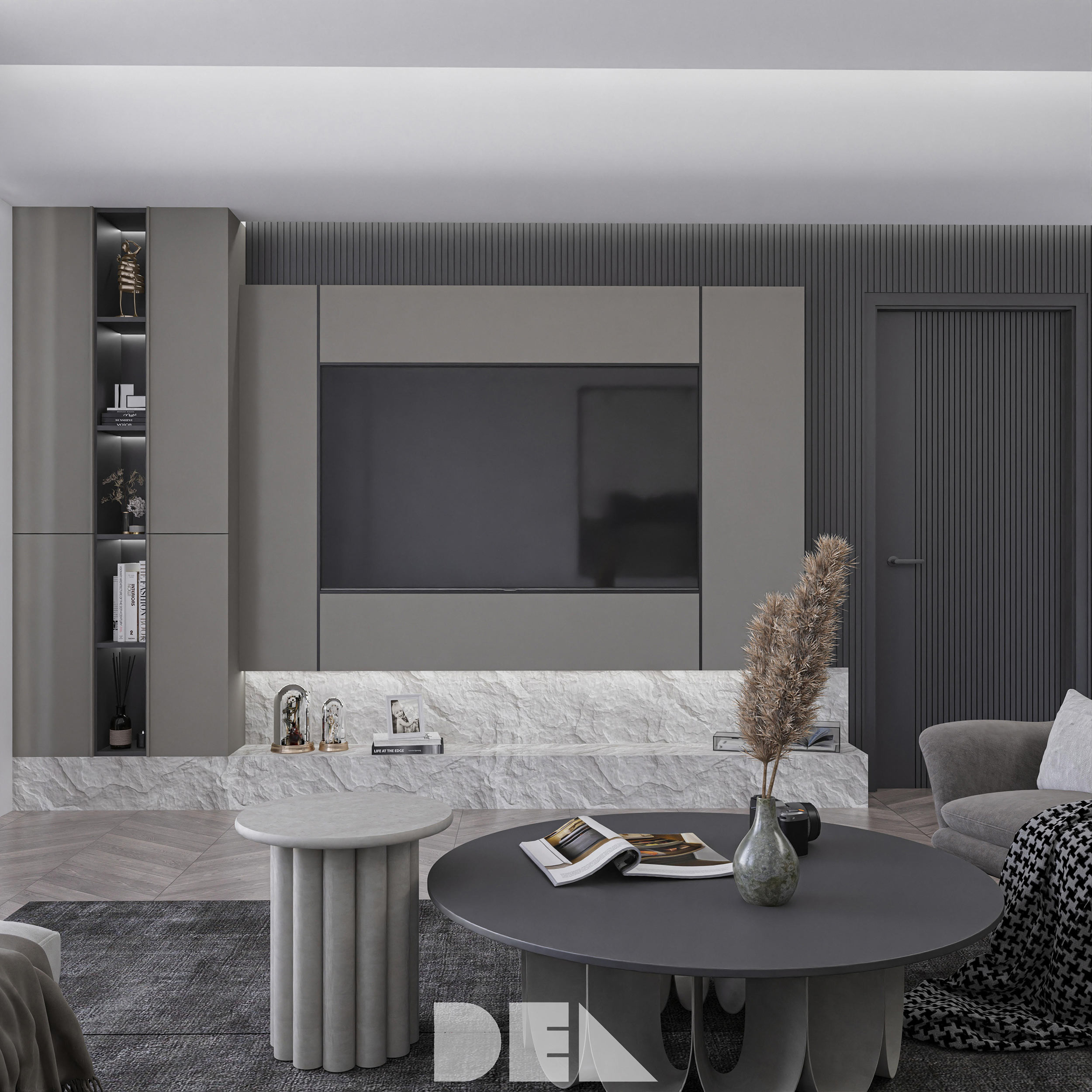 Das Sofa ist weich und einladend, perfekt zum Zurücklehnen und Entspannen. Der Fernseher ist als Mittelpunkt positioniert und ermöglicht immersive Unterhaltung. Die gesamte Farbgebung ist neutral und schafft eine beruhigende und harmonische Atmosphäre. Der Raum ist gut mit natürlichem Licht beleuchtet, wodurch der Raum vergrößert wird.