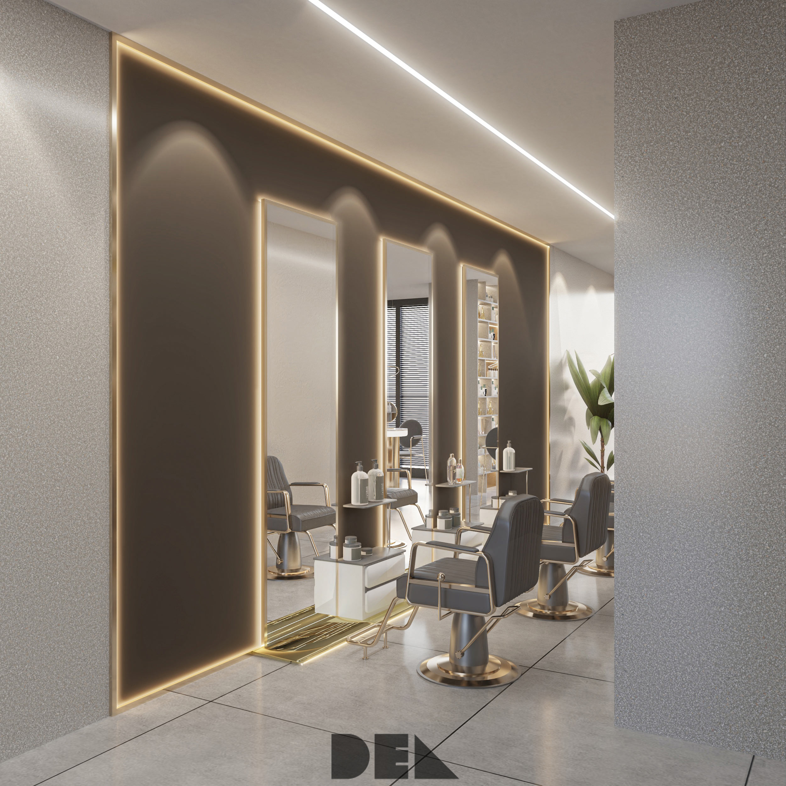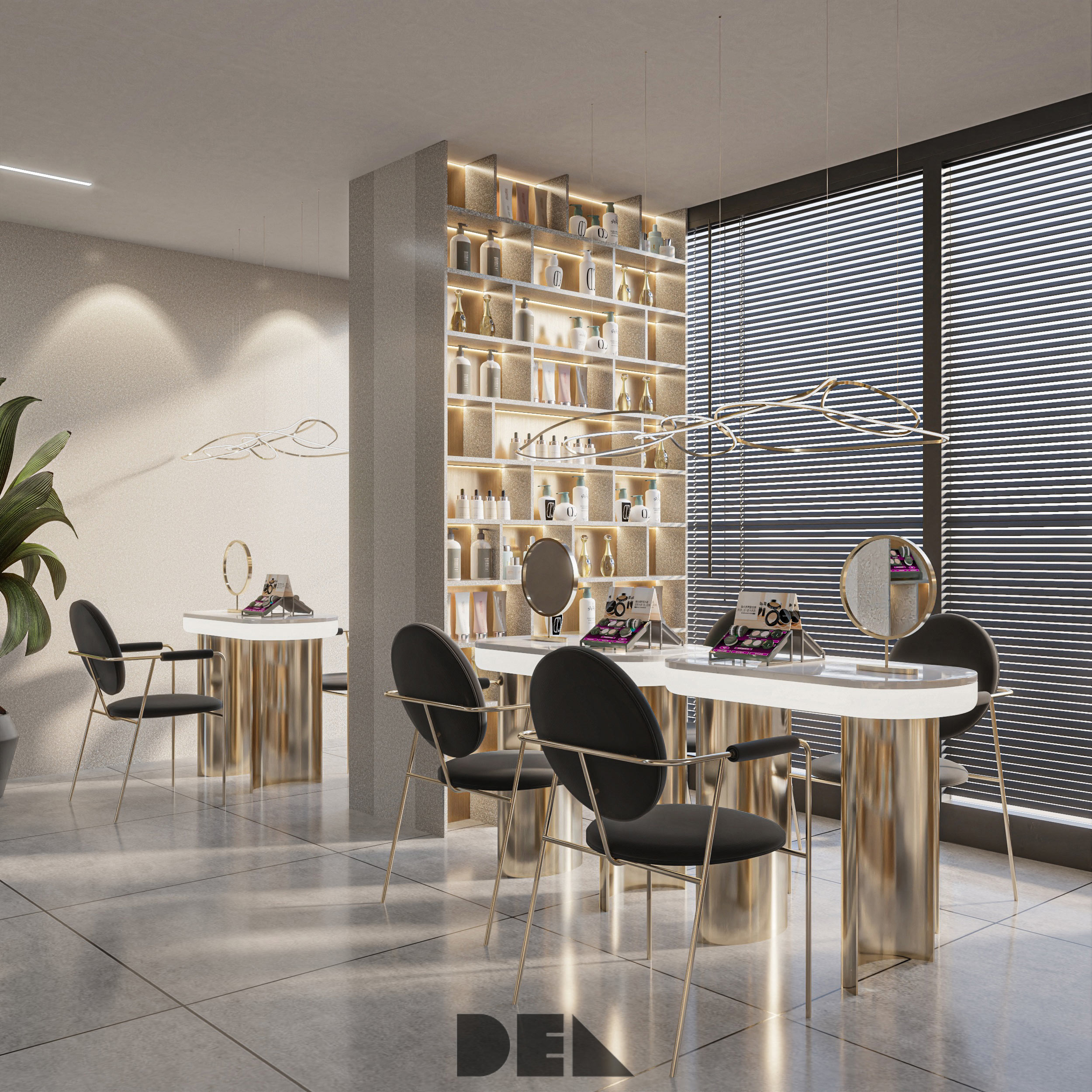 Die schlichte und minimalistische Ästhetik verleiht dem Raum ein Gefühl von Raffinesse und Eleganz. Die glänzende weiße Textur schafft eine sehr saubere und helle Atmosphäre, die perfekt für einen Schönheitssalon ist. Die Küche ist eine einzigartige Note, die ein Element der Bequemlichkeit hinzufügt und es den Mitarbeitern ermöglicht, Erfrischungen und Speisen sowohl für ihre Kunden als auch für sich selbst zuzubereiten. Die Lounge, die auch als Wartebereich dient, ist ein großartiger Ort für Kunden zum Ausruhen und Entspannen, während sie auf ihren Termin warten.