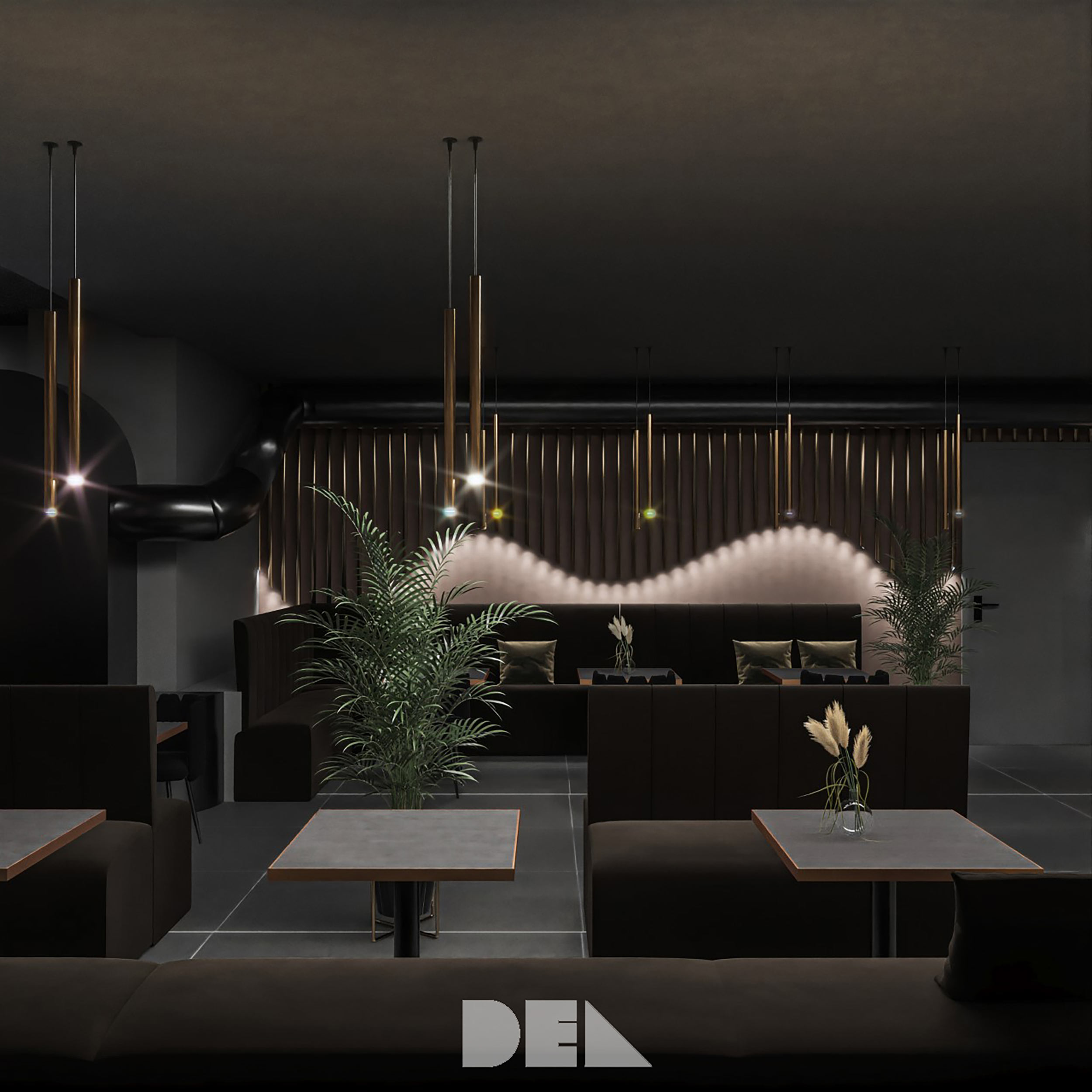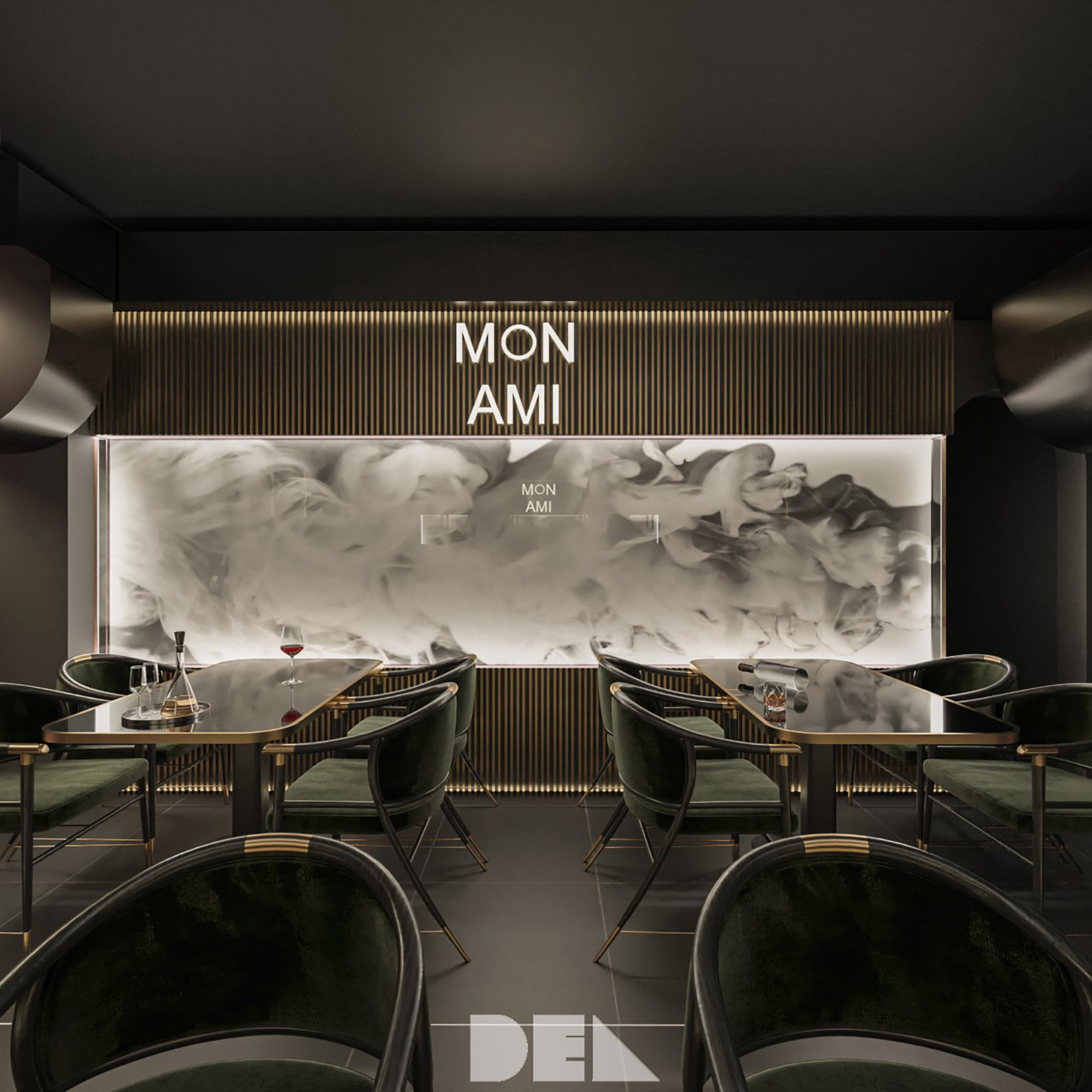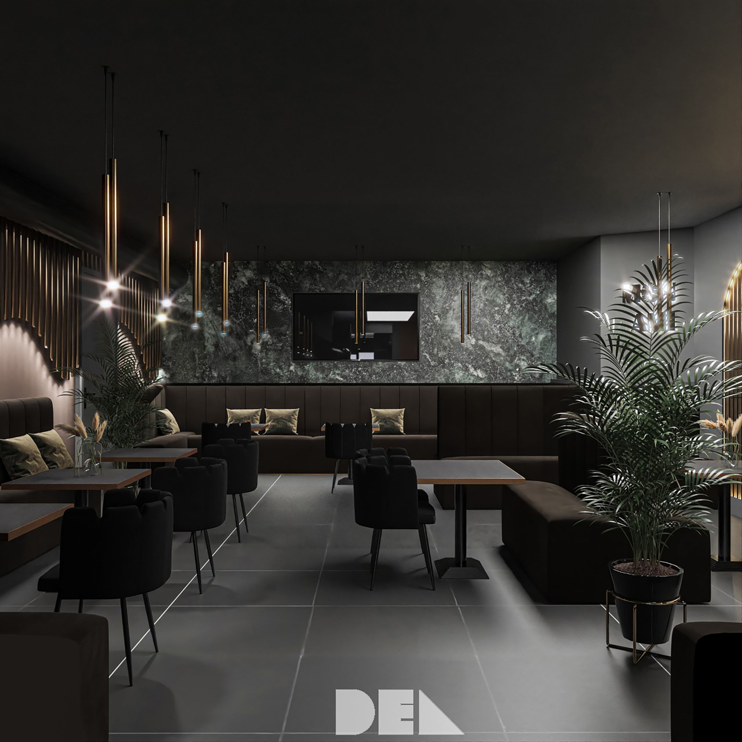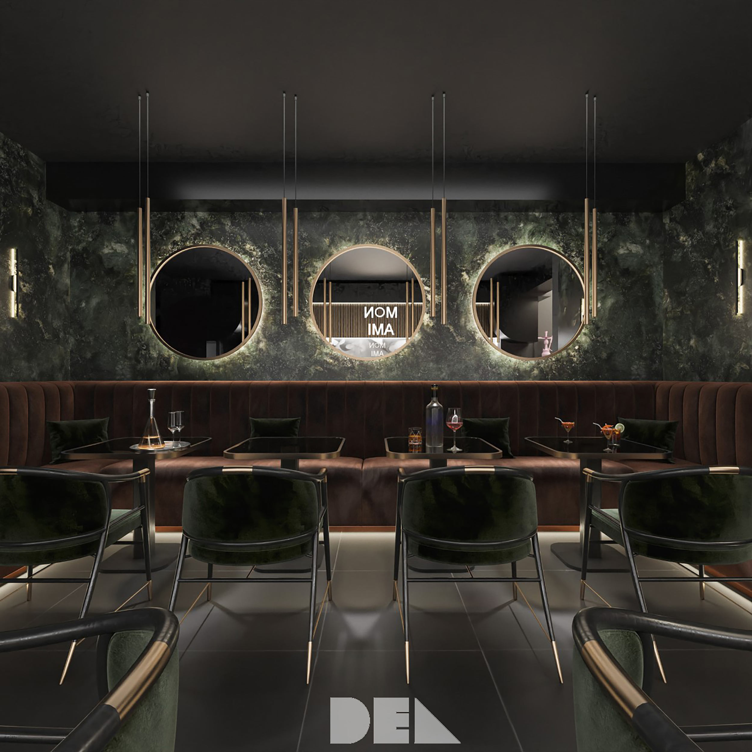Dieses Restaurant, Café und Bar konzentriert sich auf grünen Marmor und schwarze Texturen.