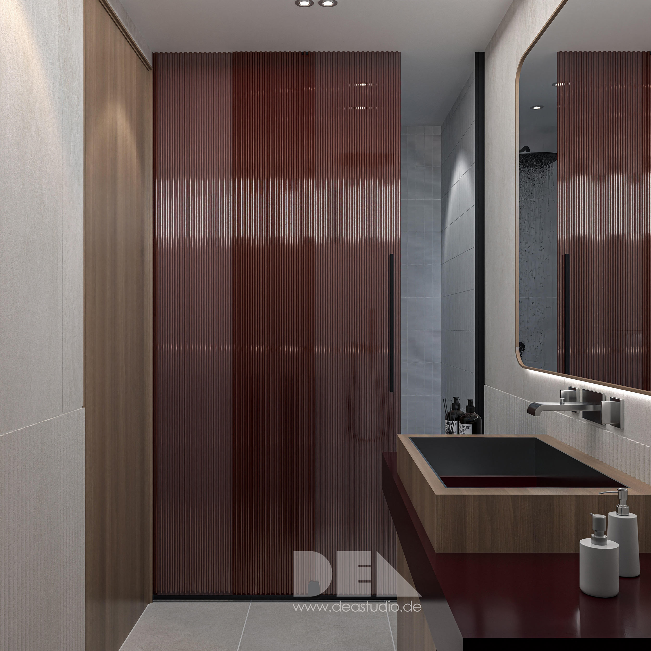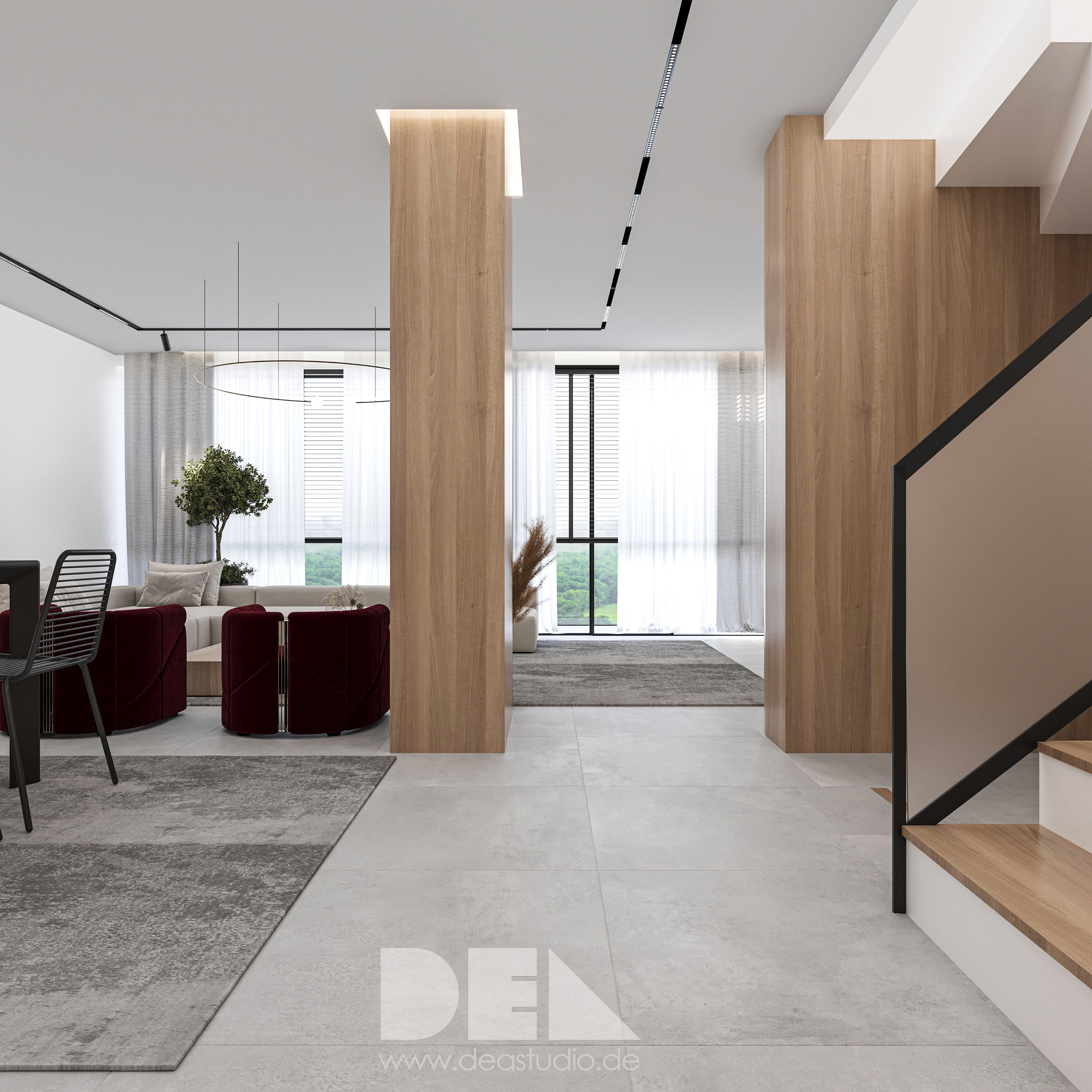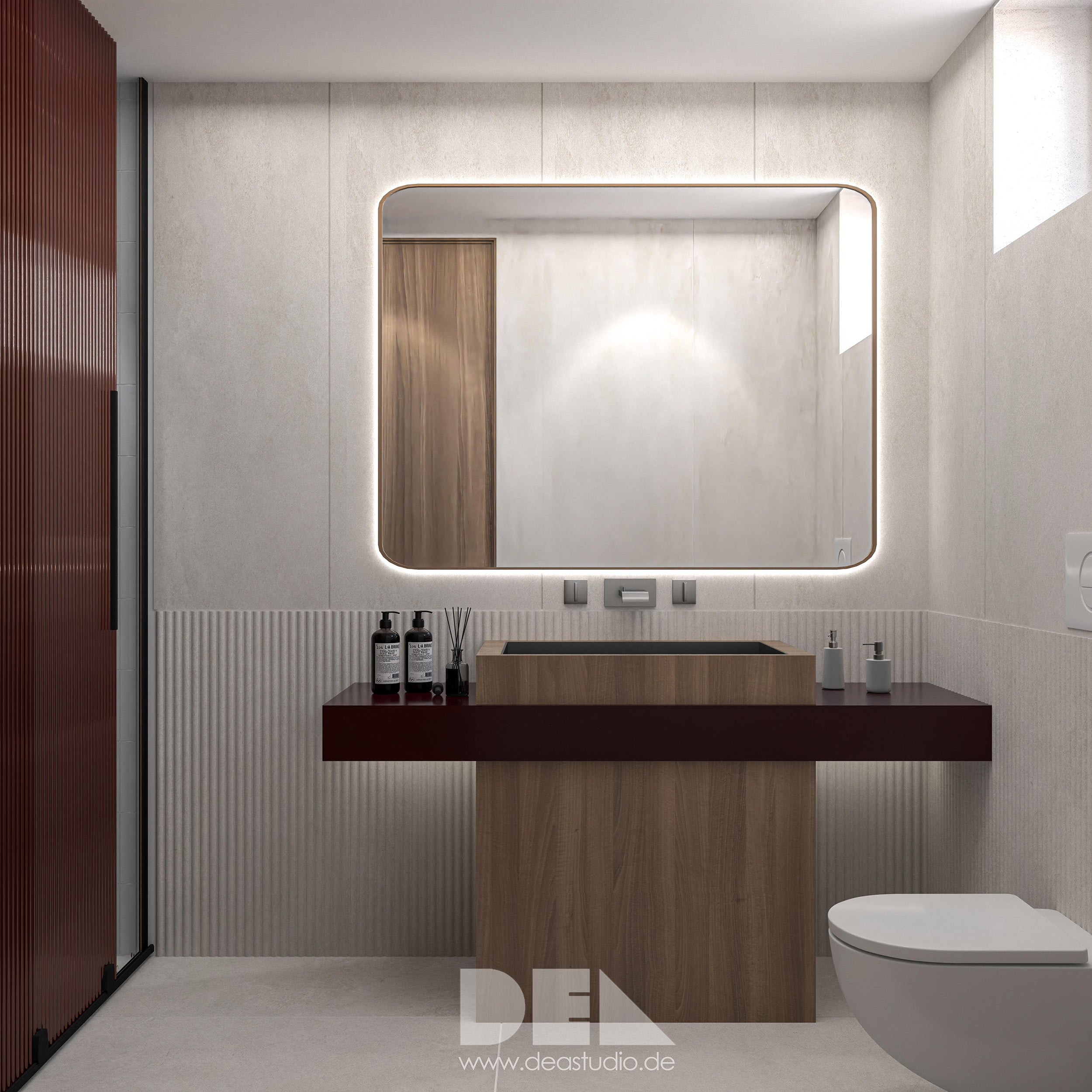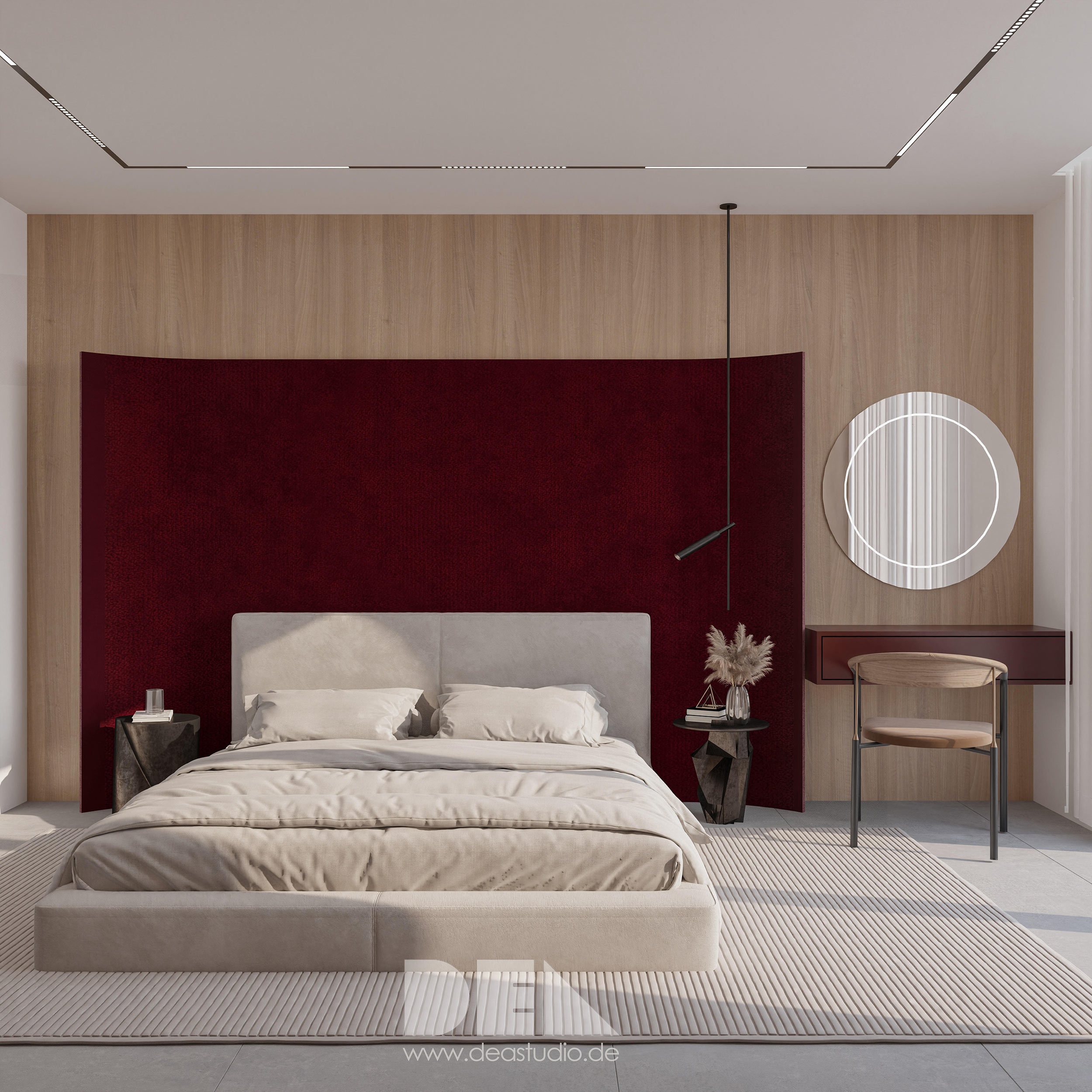 Die Farbpalette ist sehr beruhigend, mit sanften Grüntönen und dunklem Rot. Die Möbel wirken modern und komfortabel und schaffen eine einladende Atmosphäre. Der Raum scheint eine gute Ausgewogenheit der Texturen zu haben, mit einer Mischung aus glatten Oberflächen und kuscheligen Stoffen. Insgesamt vermittelt es eine Atmosphäre der Entspannung und modernen Eleganz.