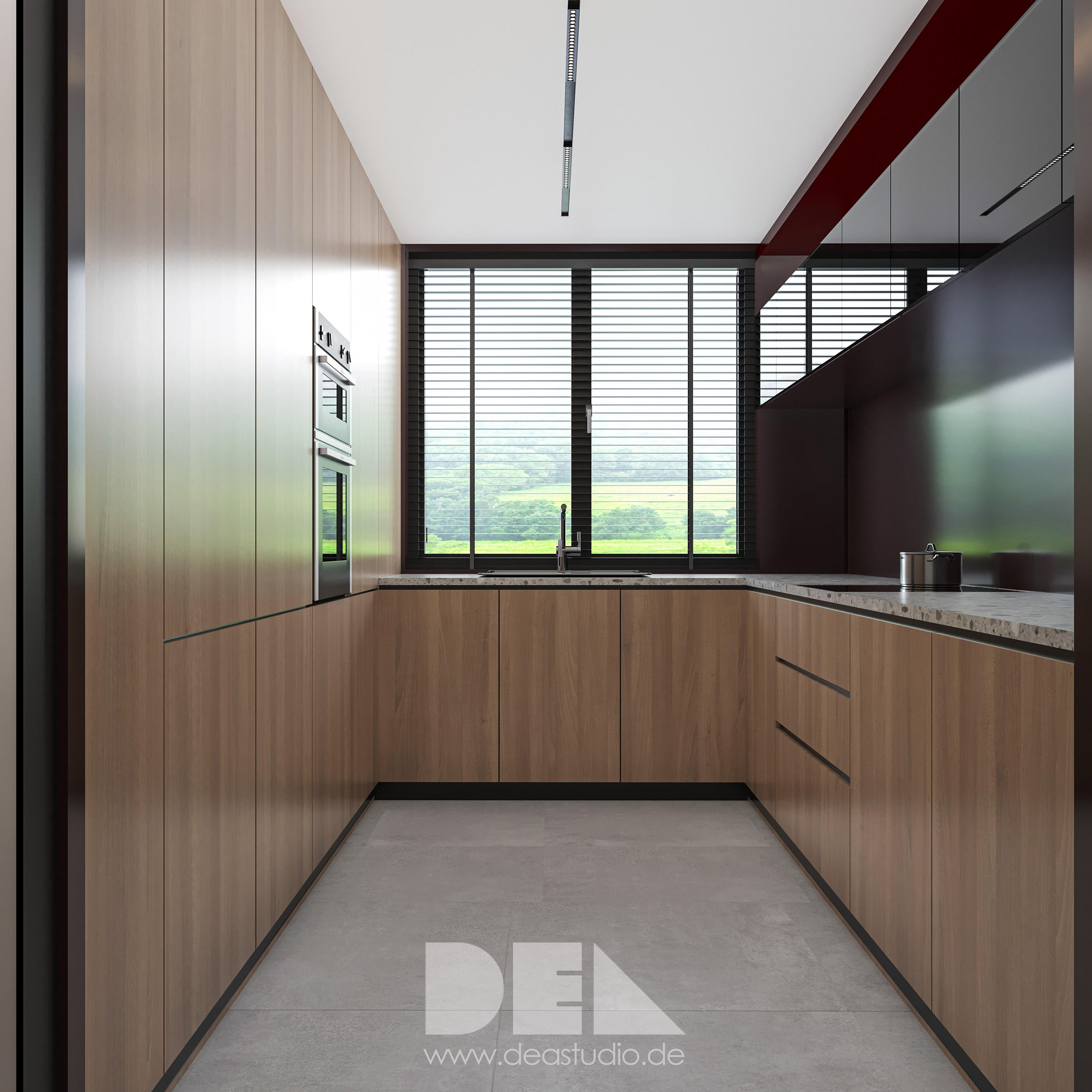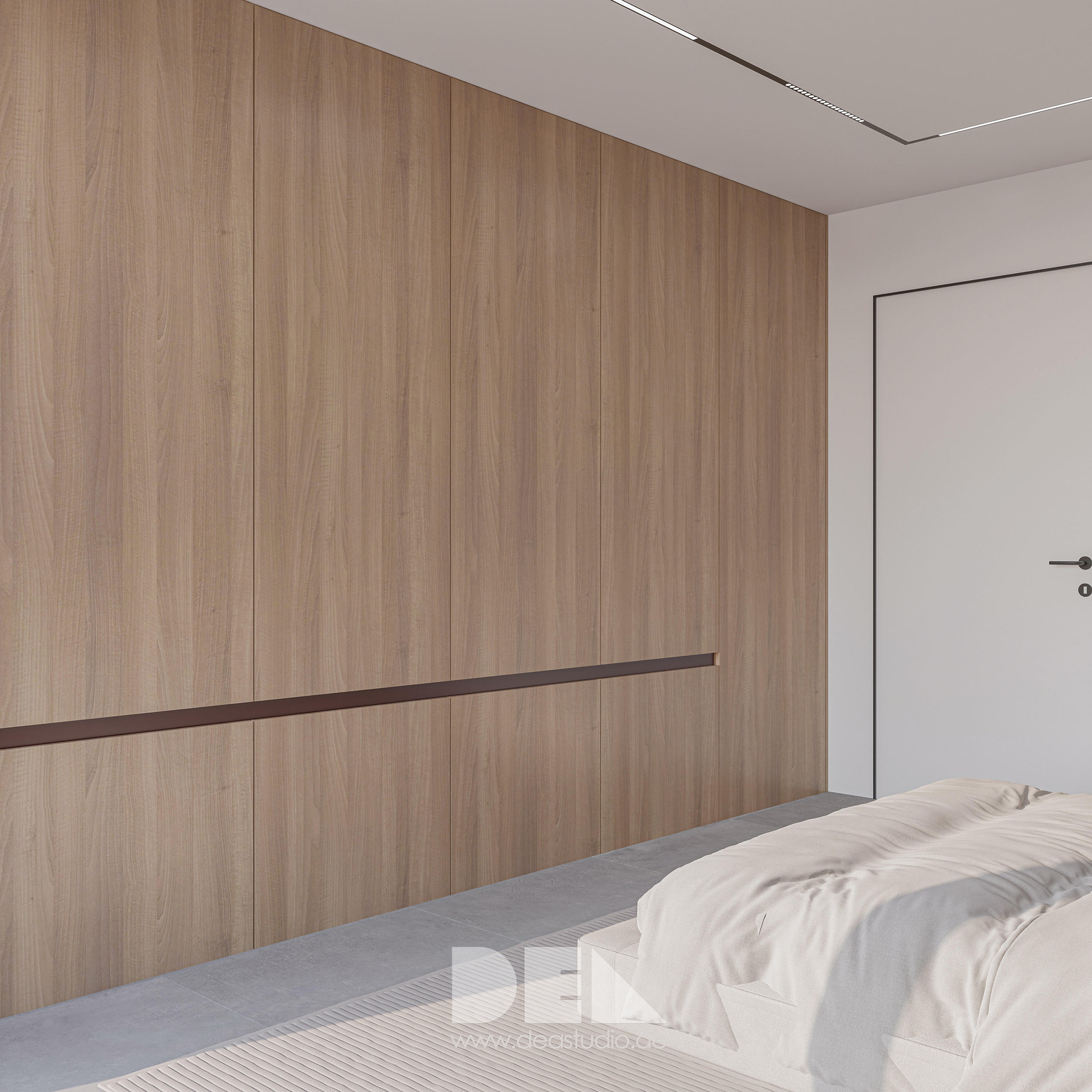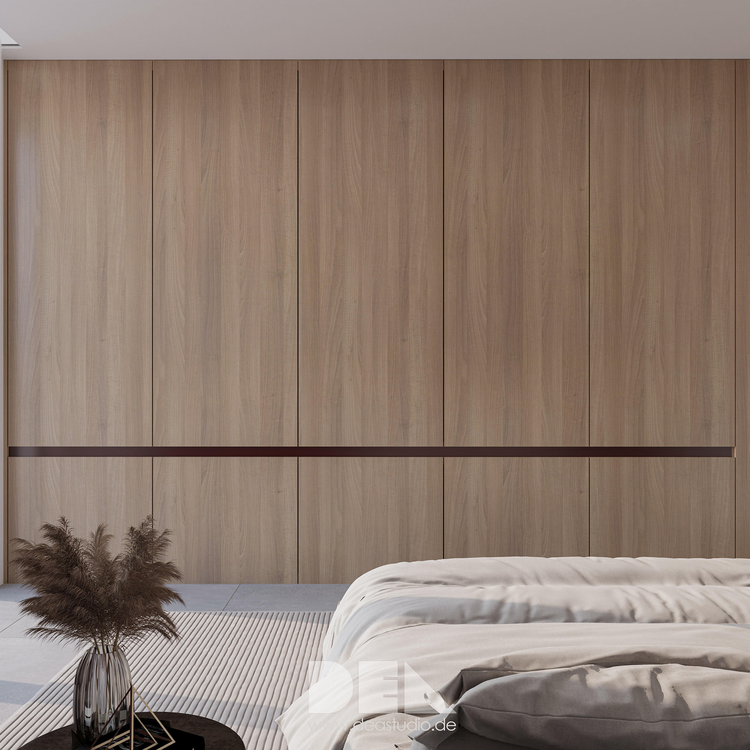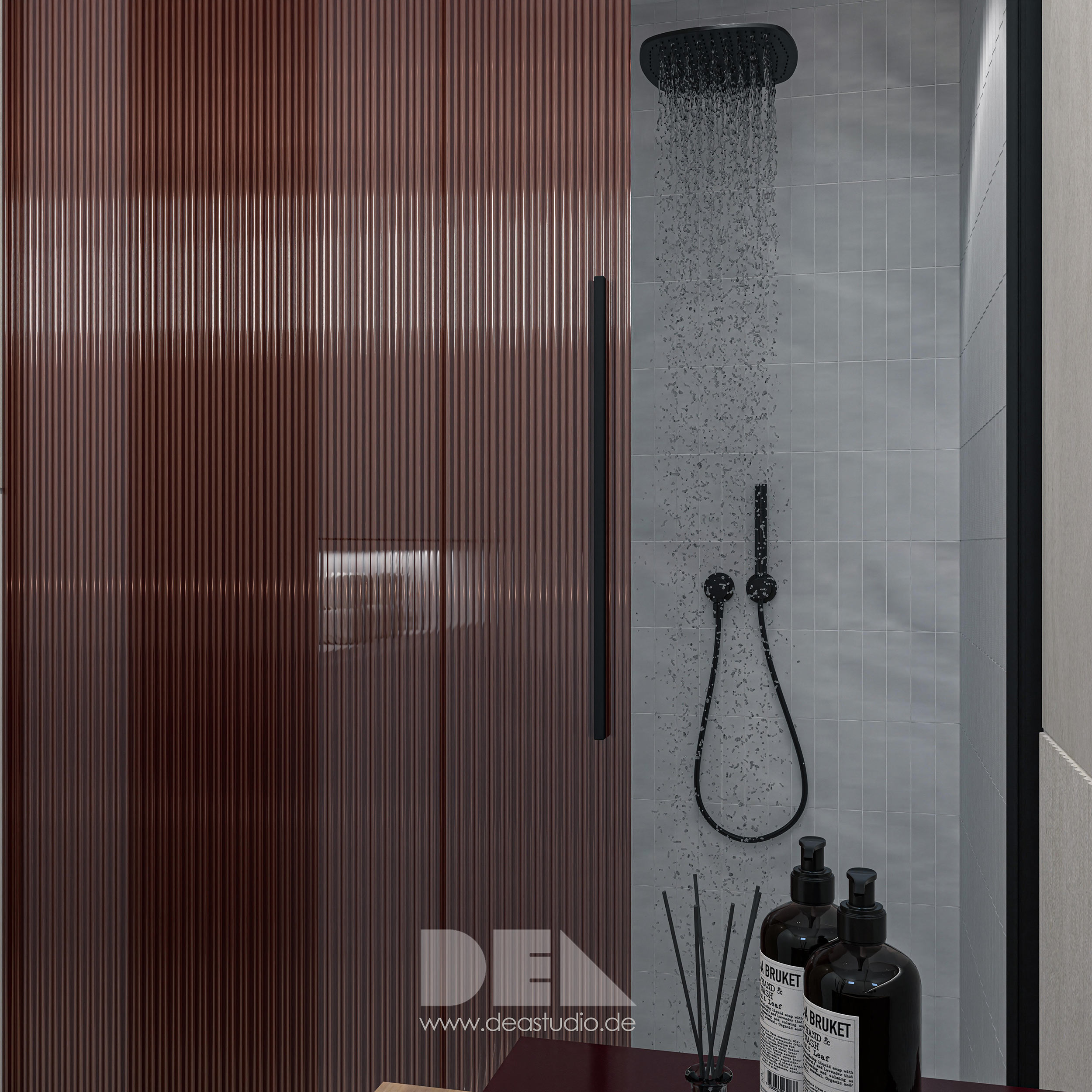 Die Farbpalette ist sehr beruhigend, mit sanften Grüntönen und dunklem Rot. Die Möbel wirken modern und komfortabel und schaffen eine einladende Atmosphäre. Der Raum scheint eine gute Ausgewogenheit der Texturen zu haben, mit einer Mischung aus glatten Oberflächen und kuscheligen Stoffen. Insgesamt vermittelt es eine Atmosphäre der Entspannung und modernen Eleganz.